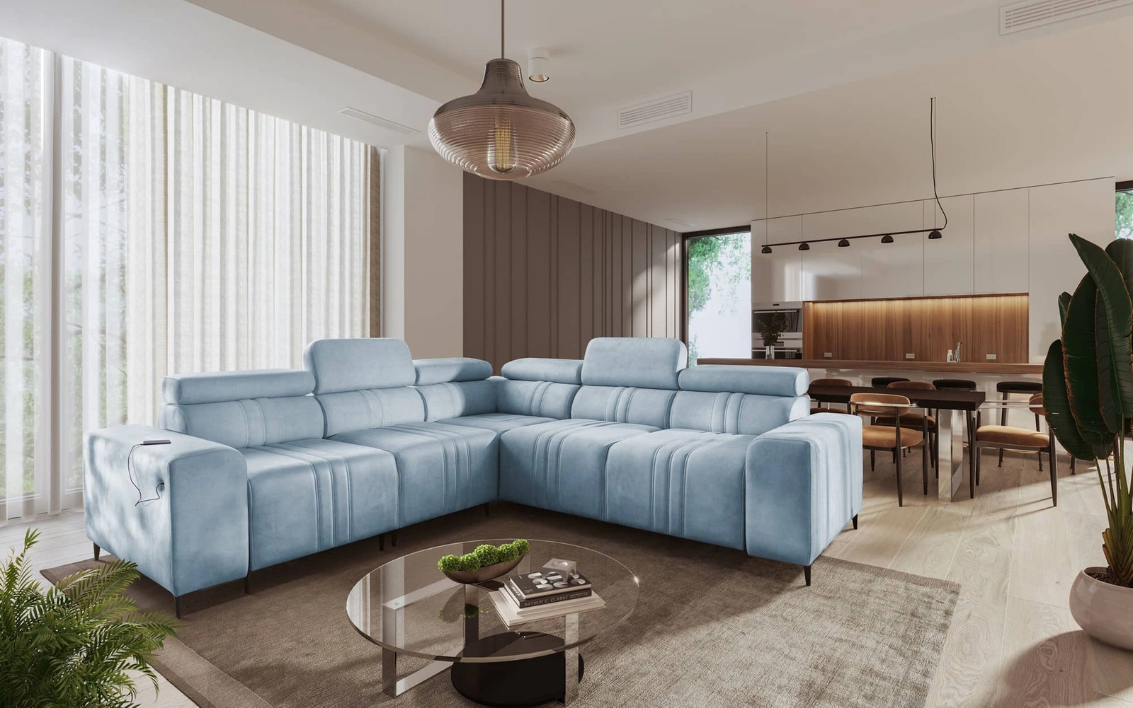 Rohová pohovka Castel III v modré barvě s nastavitelnými opěrkami hlavy je mimořádně elegantní kus nábytku se zajímavou povrchovou úpravou.