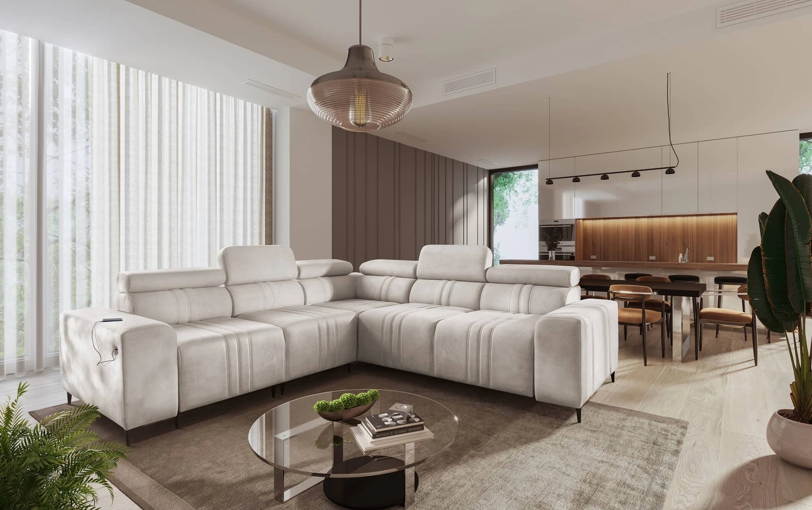 Rohová pohovka Castel III v béžové barvě s nastavitelnými opěrkami hlavy je mimořádně elegantní kus nábytku se zajímavou povrchovou úpravou.