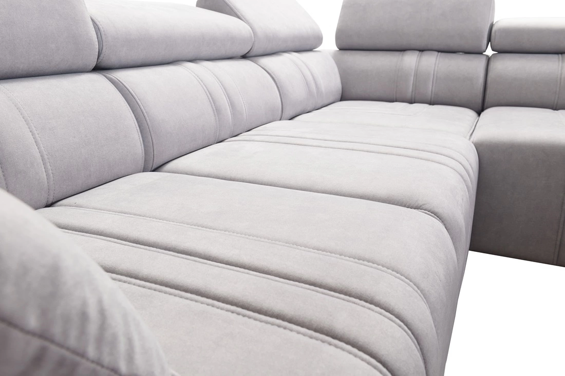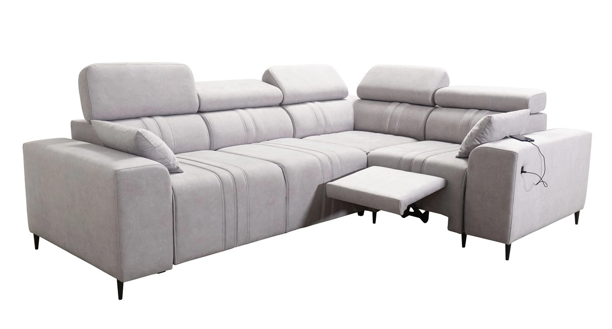 Mezi doplňky tohoto nábytku, které ocení všichni uživatelé, patří výsuvná podnožka, nastavitelné opěrky hlavy a nabíjecí zásuvka USB na boku rohové skříně.