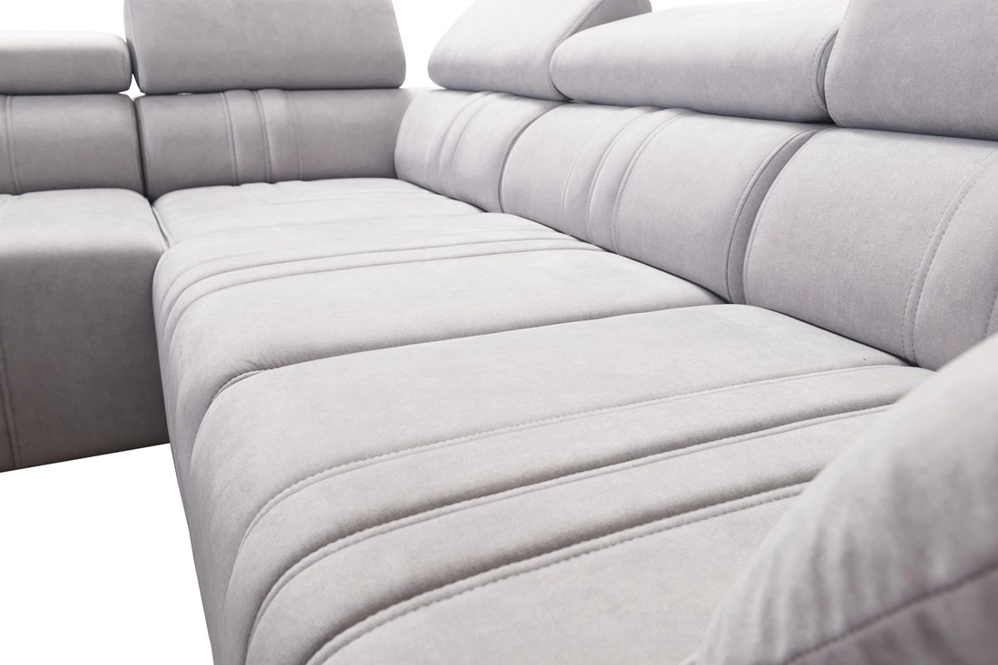 Mezi doplňky tohoto nábytku, které ocení všichni uživatelé, patří výsuvná podnožka, nastavitelné opěrky hlavy a nabíjecí zásuvka USB na boku rohové skříně.