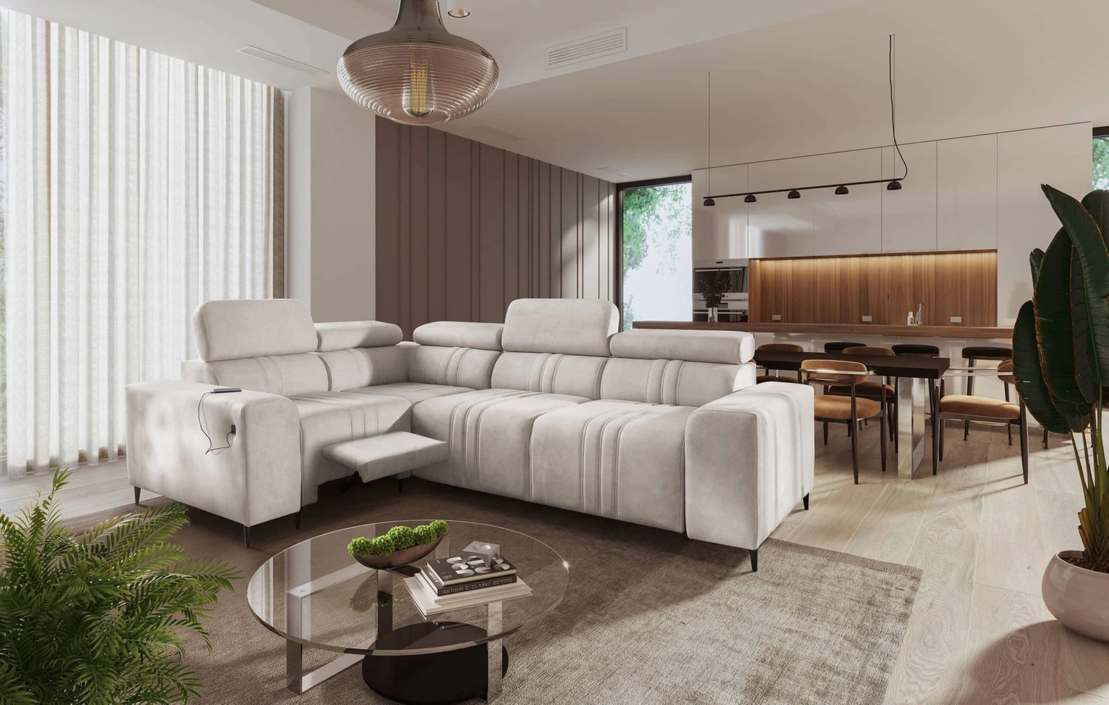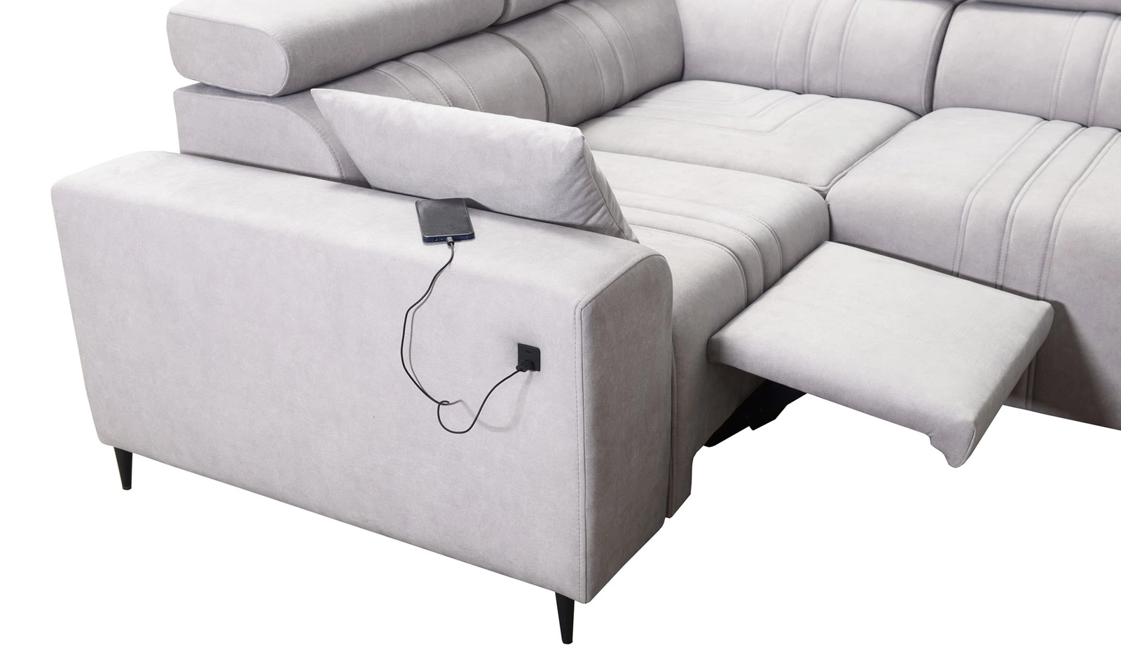 Mezi doplňky tohoto nábytku, které ocení všichni uživatelé, patří výsuvná podnožka, nastavitelné opěrky hlavy a nabíjecí zásuvka USB na boku rohové skříně.