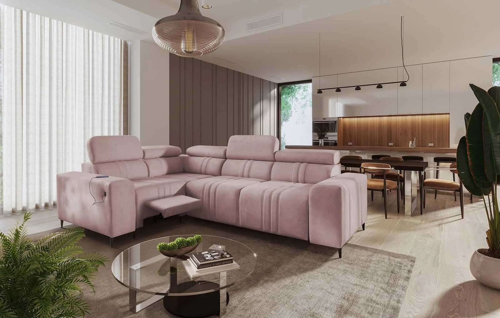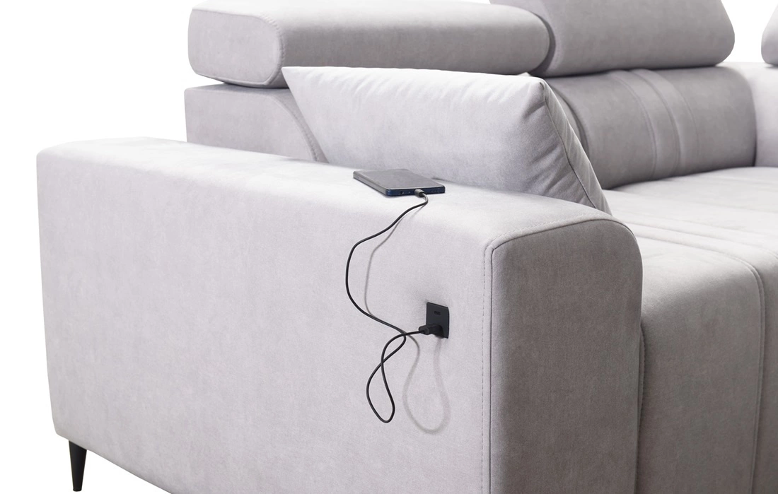 Mezi doplňky tohoto nábytku, které ocení všichni uživatelé, patří výsuvná podnožka, nastavitelné opěrky hlavy a nabíjecí zásuvka USB na boku rohové skříně.