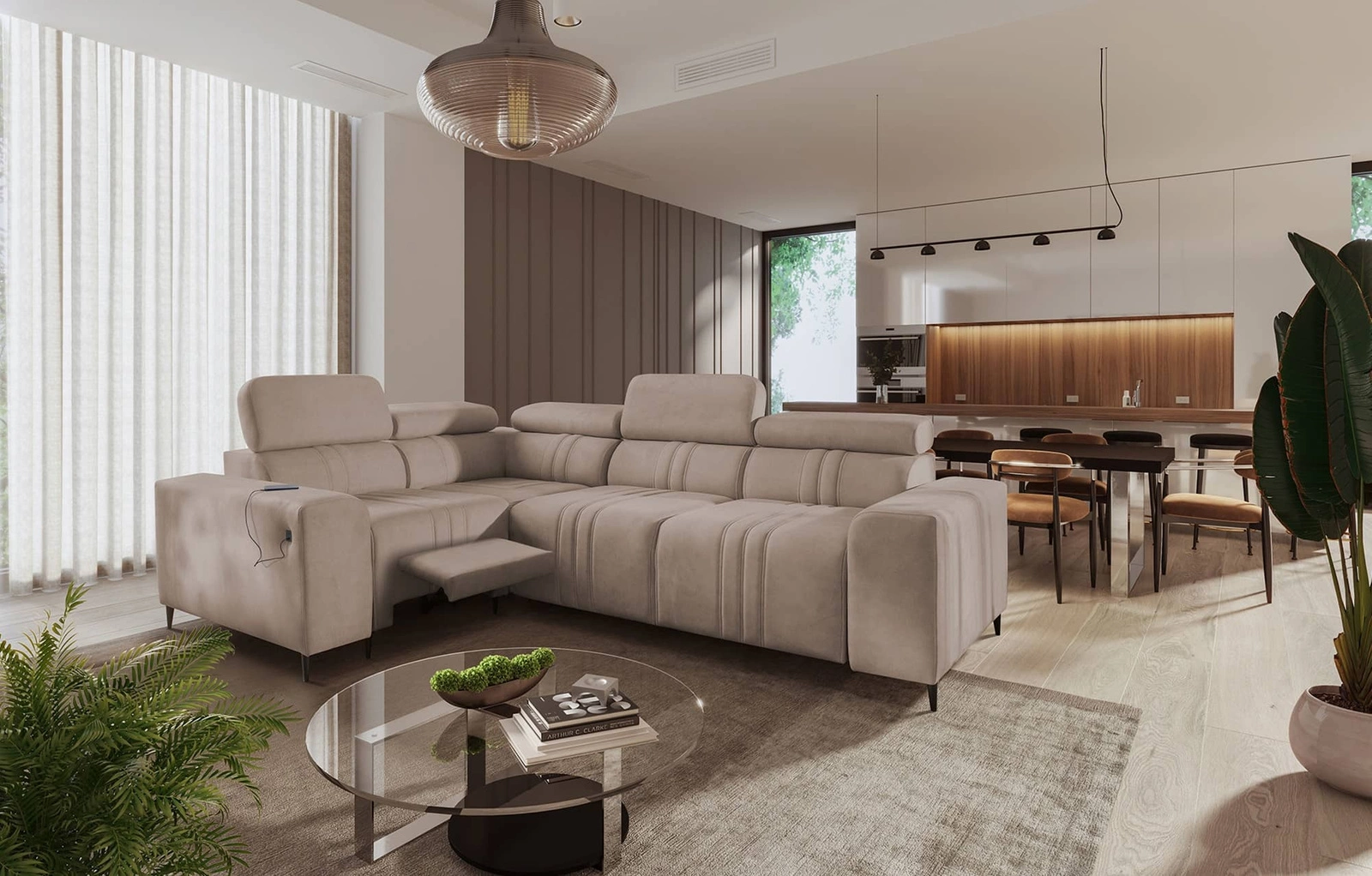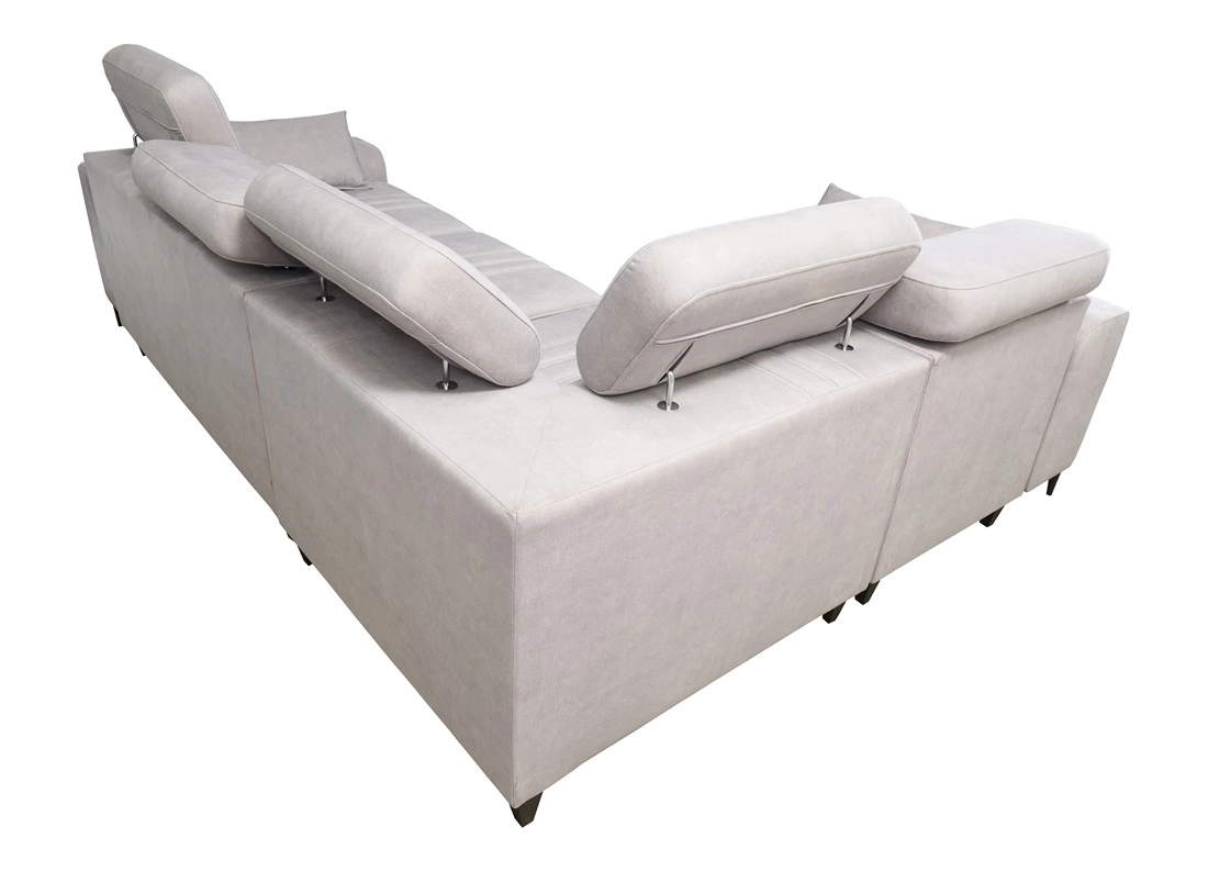 Mezi doplňky tohoto nábytku, které ocení všichni uživatelé, patří výsuvná podnožka, nastavitelné opěrky hlavy a nabíjecí zásuvka USB na boku rohové skříně.