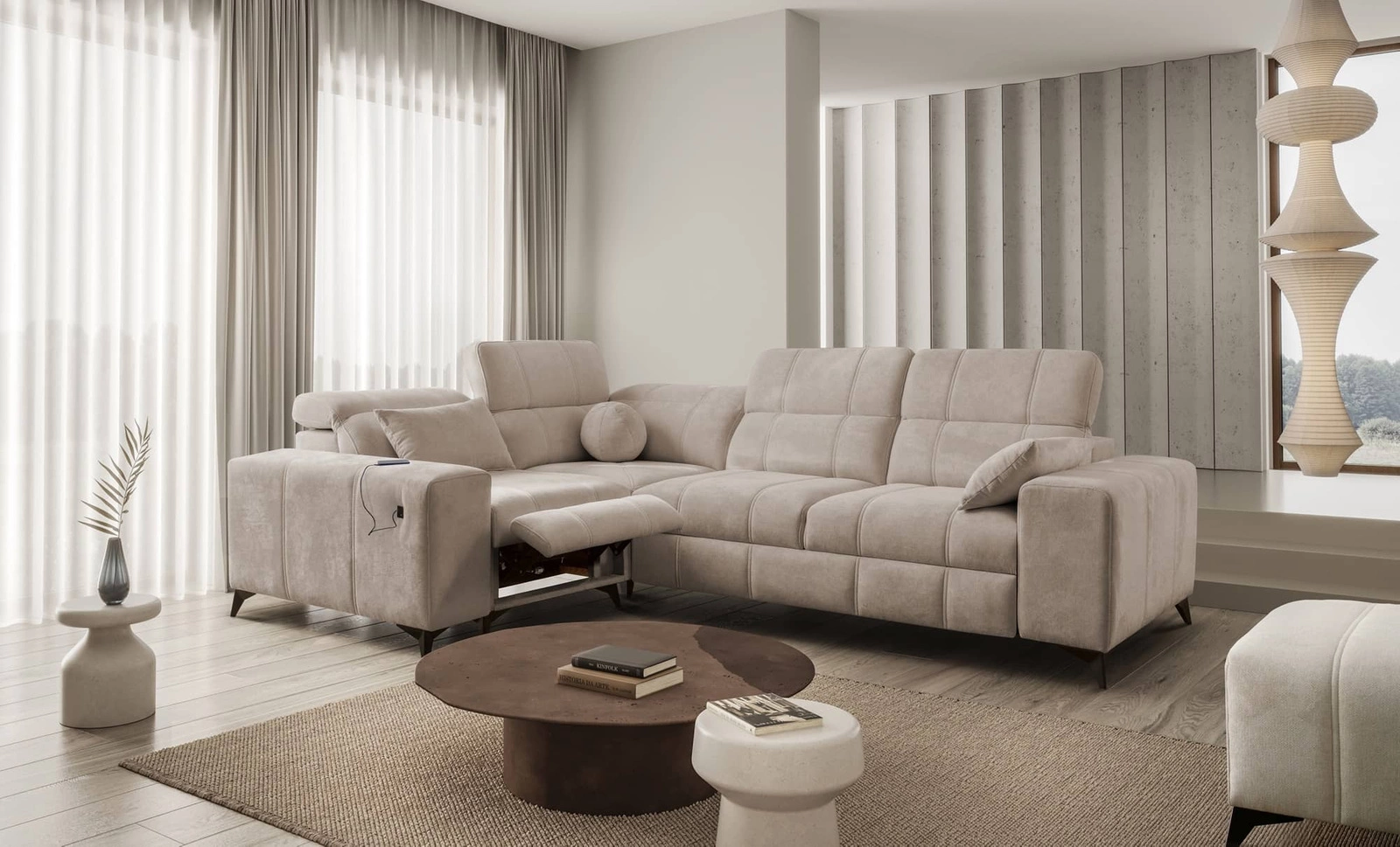 Mezi doplňky tohoto nábytku, které ocení všichni uživatelé, patří výsuvná podnožka, nastavitelné opěrky hlavy, funkce spánku a nabíjecí zásuvka USB na boku rohové jednotky.
