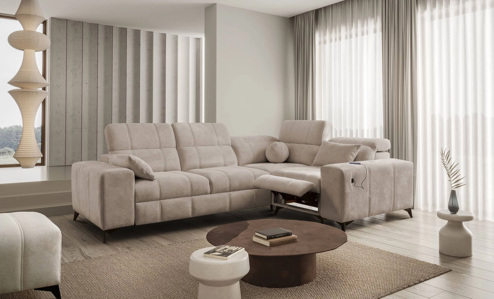 Mezi doplňky tohoto nábytku, které ocení všichni uživatelé, patří výsuvná podnožka, nastavitelné opěrky hlavy, funkce spánku a nabíjecí zásuvka USB na boku rohové jednotky.