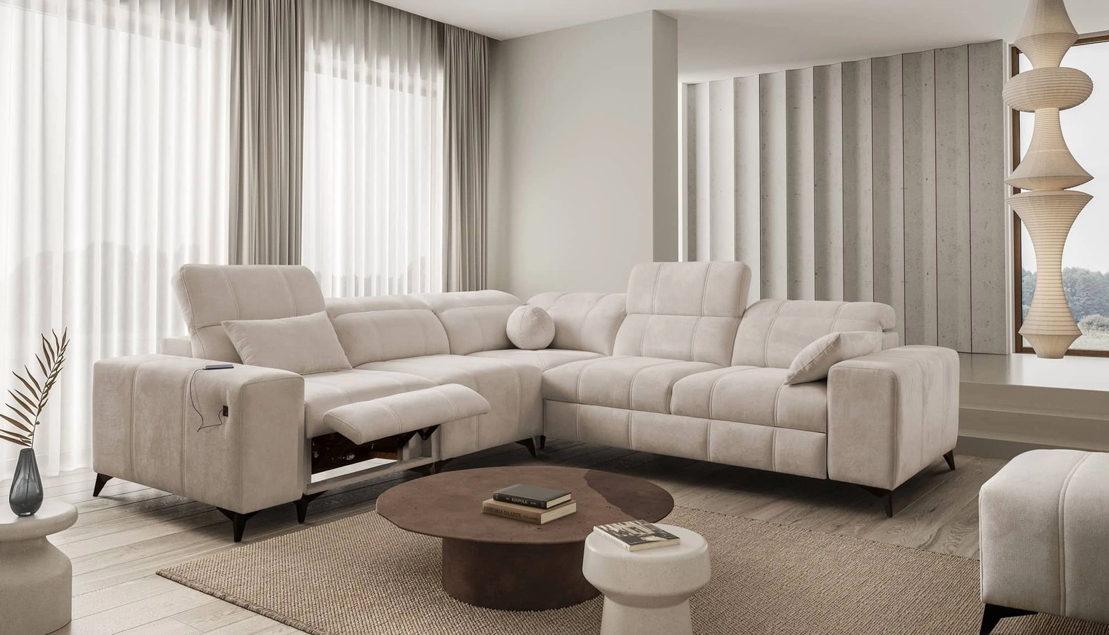 Rohová pohovka Penejos III Lux v béžové barvě s výsuvnou podnožkou je mimořádně pohodlný kus nábytku se zajímavou povrchovou úpravou.