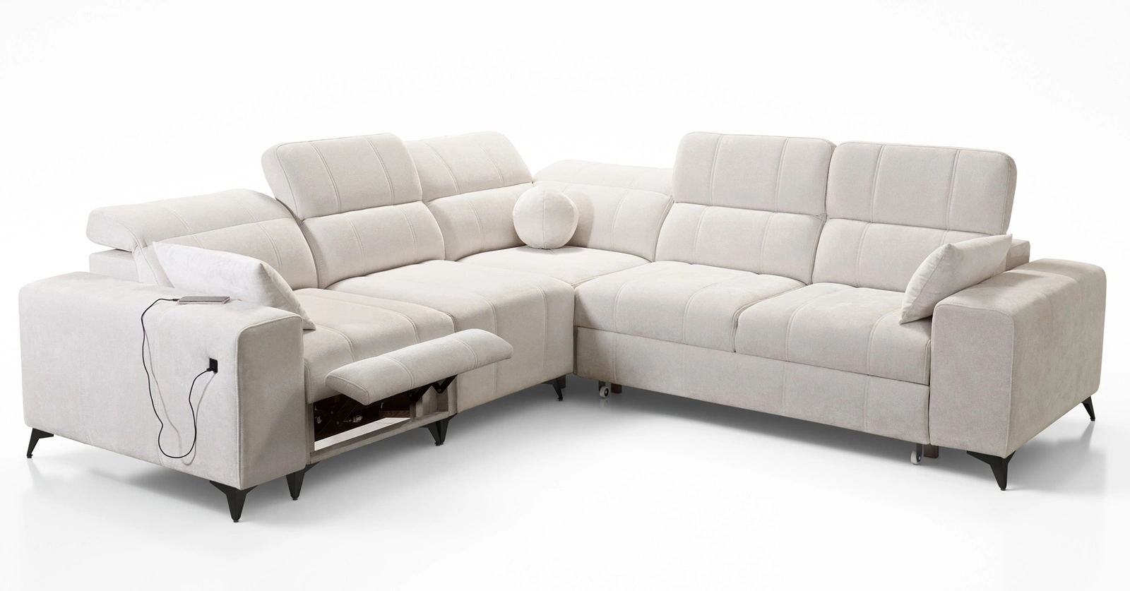 Mezi doplňky tohoto nábytku, které ocení všichni uživatelé, patří výsuvná podnožka, kontejner na lůžkoviny, funkce spaní a nabíjecí zásuvka USB v boční části rohové skříně.