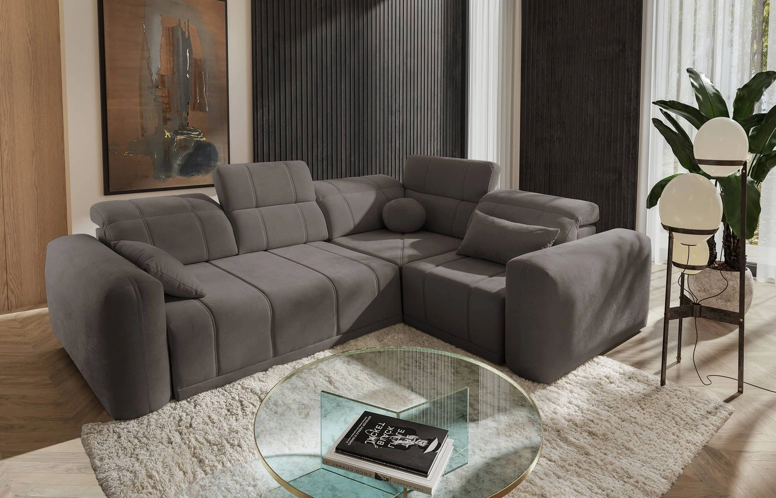 Rohová pohovka Cetara II v šedohnědé barvě je mimořádně funkční kus nábytku se stylovou povrchovou úpravou.