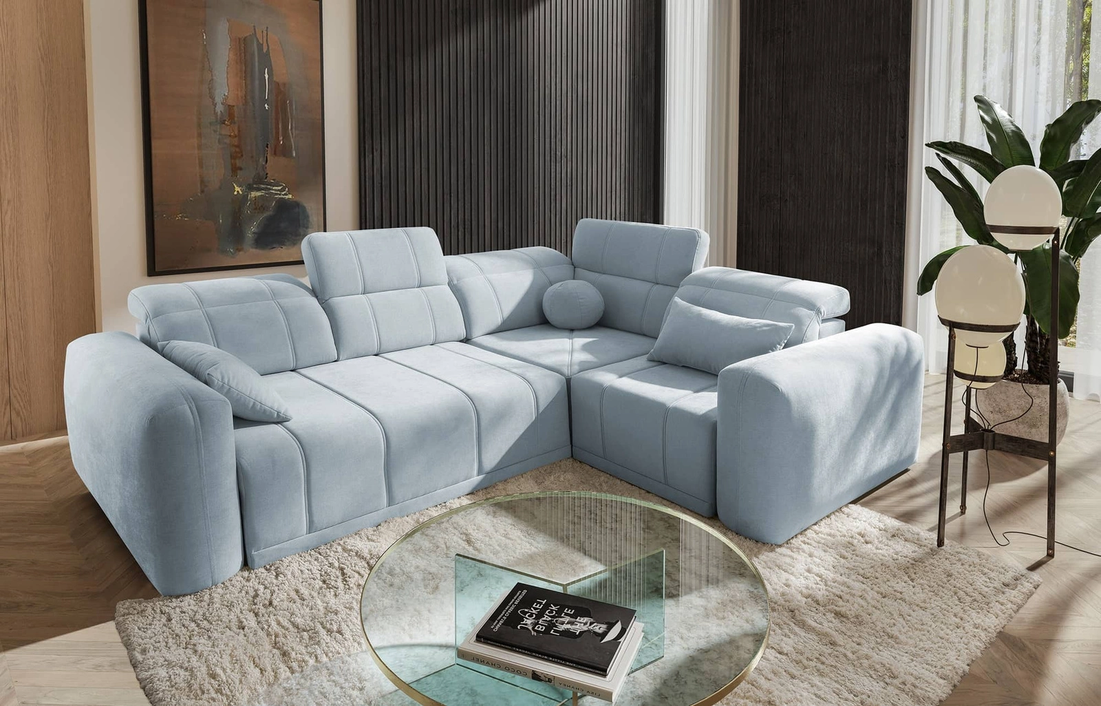 Čalounická tkanina Wind s výrazná vazba zaujme svým designem, ale také poskytuje jedinečný komfort. Měkká a na dotek příjemná tkanina dokonale podtrhne originální design rohové skříně. Čalounická tkanina se vyznačuje vysokou kvalitou odolností proti oděru, je zpomalovač hoření, a je také snadno se udržuje v čistotě. Díky tomu bude roh dlouho vypadat esteticky a elegantně. Rohová jednotka je vyrobena z vysoce kvalitních materiálů, které jsou odolné vůči vnějším vlivům, jako je čalounění nábytku a různé druhy nárazů.