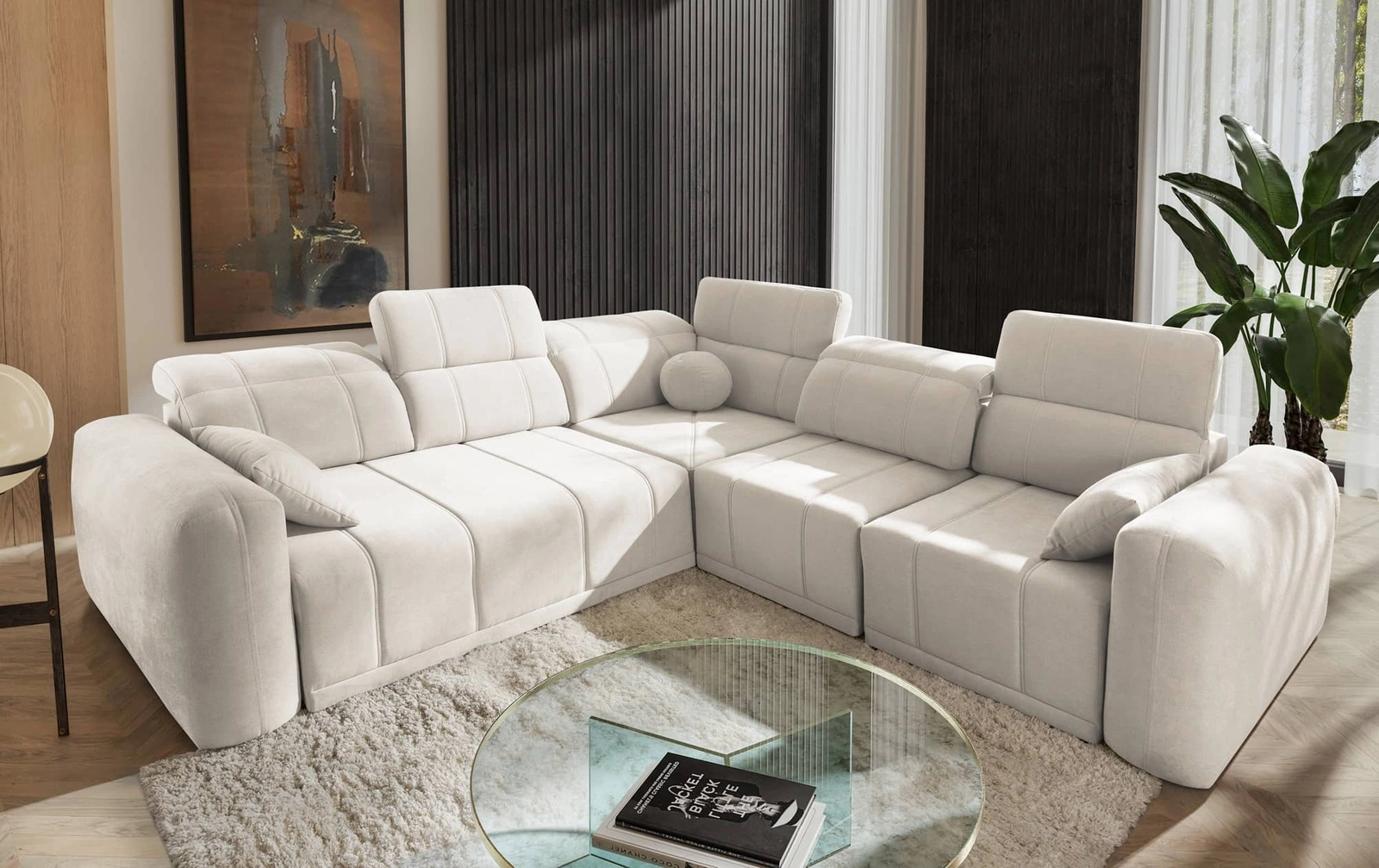 Rohová sedačka s funkcí spaní Cetara III krémová pravá ergonomická rohová sedačka s posuvným opěradlem a nastavitelnými opěrkami hlavy