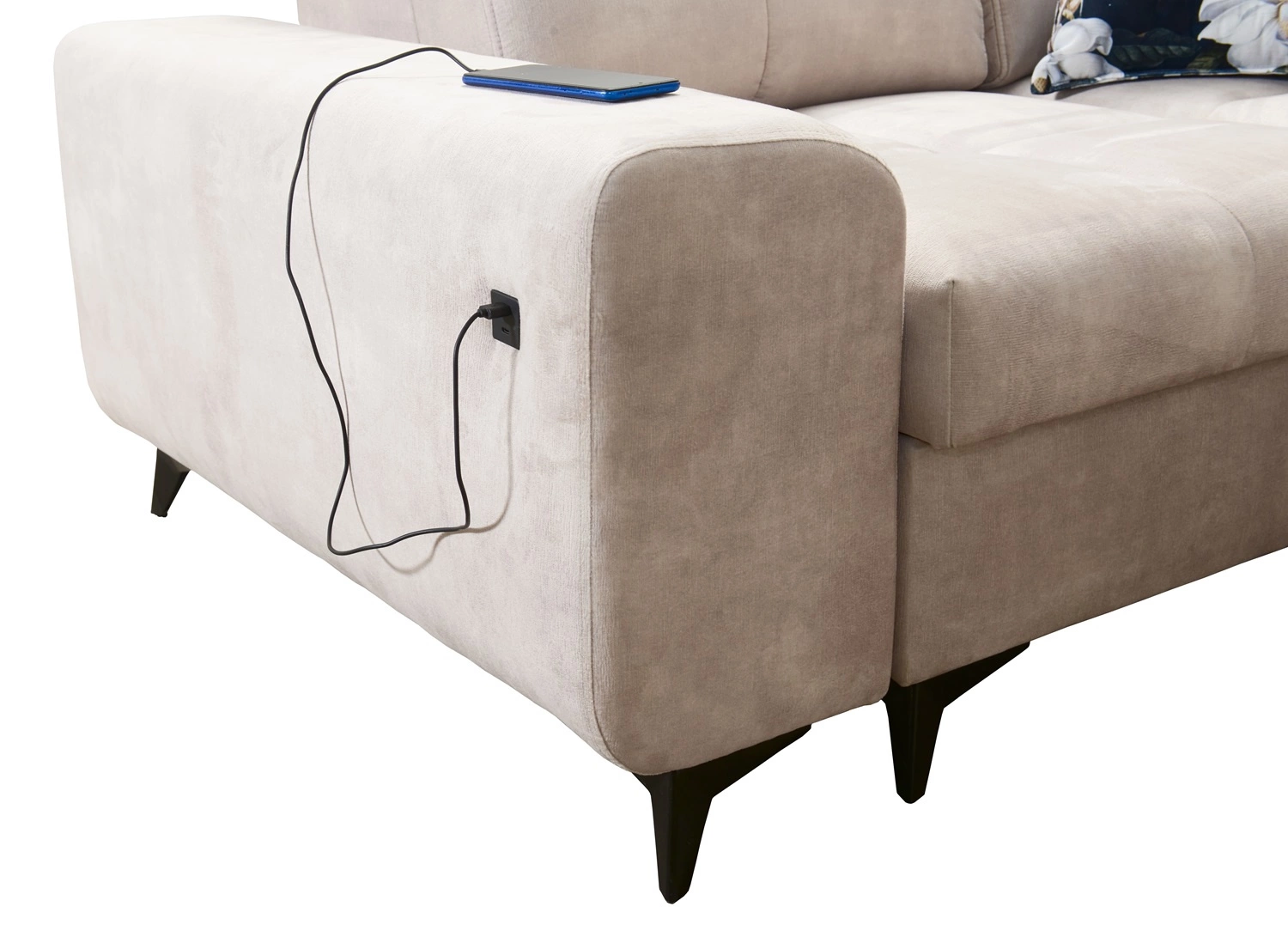Mezi doplňky tohoto nábytku, které ocení všichni uživatelé, patří dva kontejnery na lůžkoviny, nastavitelné opěrky hlavy a nabíjecí zásuvka USB na boku rohové skříně.