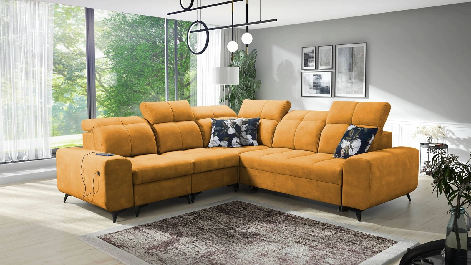 Rohová pohovka Buffalo III ve žluté barvě s nastavitelnými opěrkami hlavy je zajímavě vypadající kus nábytku s elegantním povrchem.