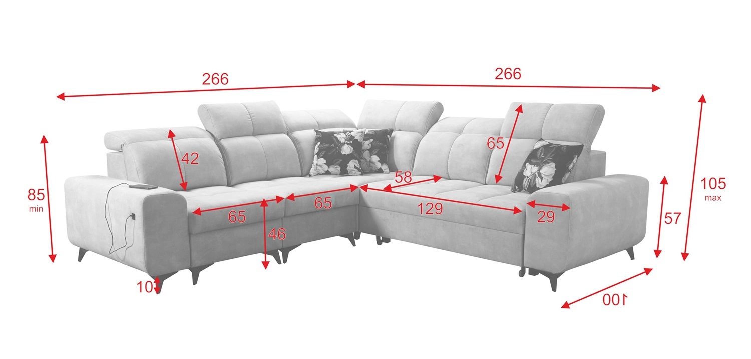 Rozměry nábytku umožňují vyplnění prostoru v prostorném obývacím pokoji nebo zasedací místnosti. Šířka rohu 266 cm, maximální výška 105 cm a hloubka 266 cm. Spací plocha rohové jednotky je 129x190 cm. Výška sedadla nábytku je 46 cm a maximální výška opěradla je 65 cm. Vlnité pružiny a polyuretanová pěna T30 je materiál, z něhož je vyrobeno sedadlo rohu. Pevné opěradlo s nastavitelnými opěrkami hlavy umožní snadné adaptace úhel opěrek hlavy podle vašich preferencí a zaručí vám pohodlný odpočinek po dlouhém dni, který oceníte vy, vaši blízcí i hosté, kteří se na tuto jedinečnou rohovou pohovku posadí.