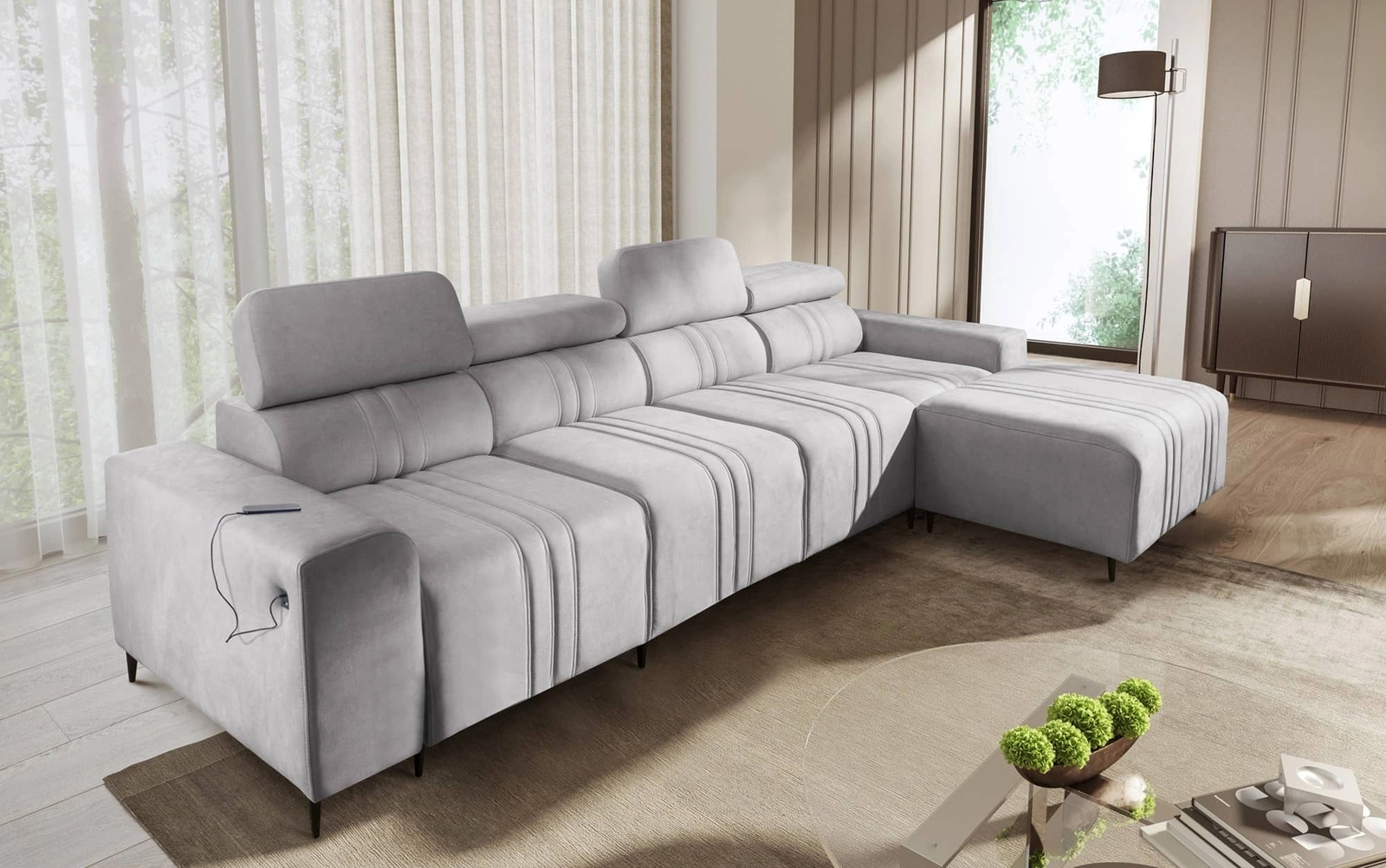 Mezi doplňky tohoto nábytku, které ocení všichni uživatelé, patří kontejner na lůžkoviny, nastavitelné opěrky hlavy a nabíjecí zásuvka USB na boku rohové skříně.