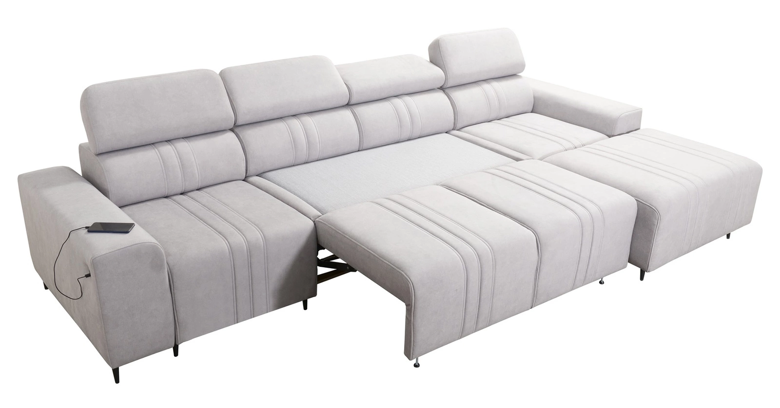Mezi doplňky tohoto nábytku, které ocení všichni uživatelé, patří kontejner na lůžkoviny, nastavitelné opěrky hlavy a nabíjecí zásuvka USB na boku rohové skříně.