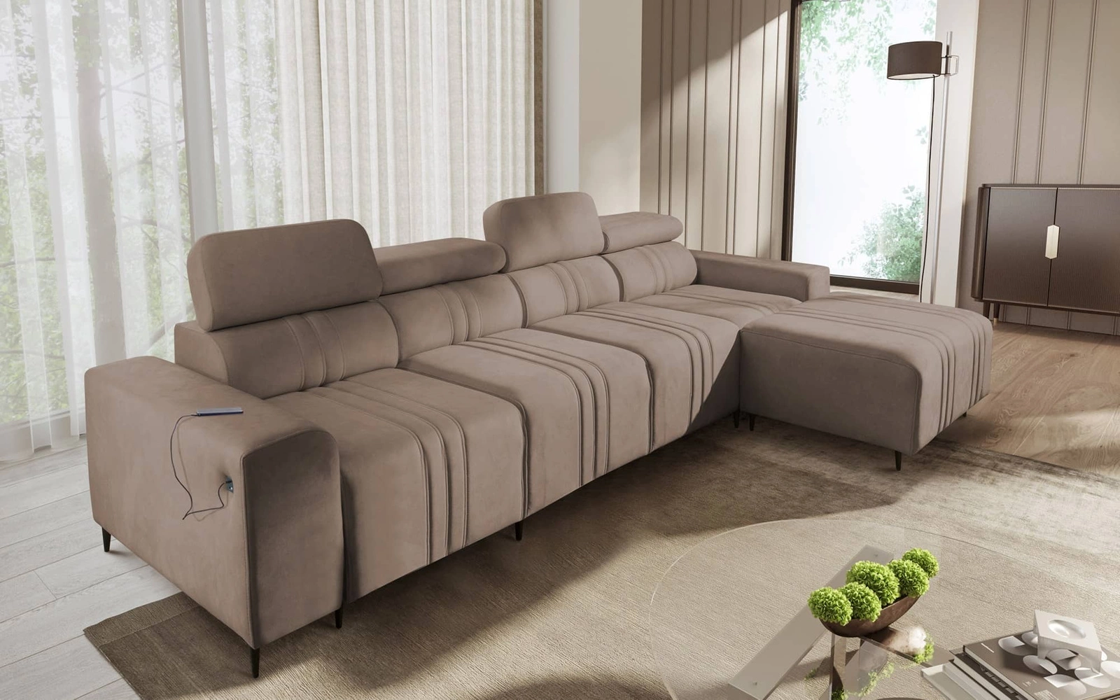 Rohová jednotka Castel XII ve světle hnědé barvě s nastavitelnými opěrkami hlavy je mimořádně elegantní kus nábytku se zajímavou povrchovou úpravou.