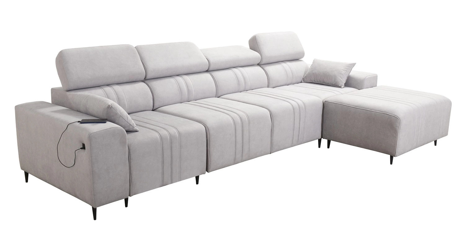 Mezi doplňky tohoto nábytku, které ocení všichni uživatelé, patří kontejner na lůžkoviny, nastavitelné opěrky hlavy a nabíjecí zásuvka USB na boku rohové skříně.