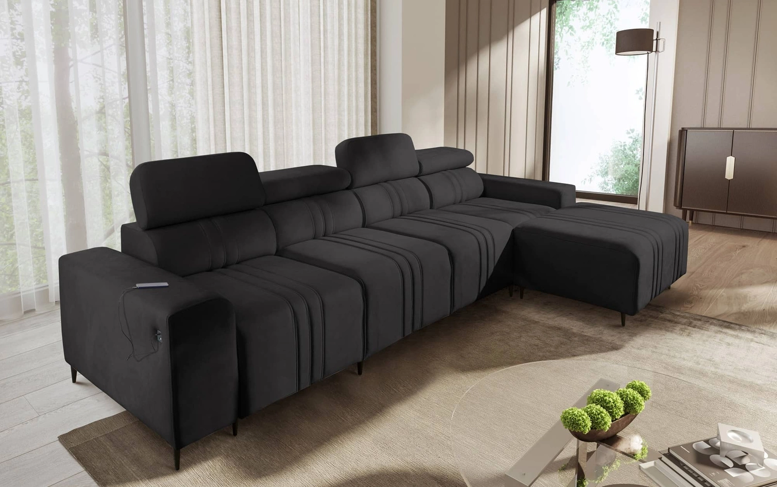 Rohová sedačka s funkcí spaní Castel XII grafitová pravá strana stylová a pohodlná rohová sedačka do obývacího pokoje funkční nastavitelné opěrky hlavy