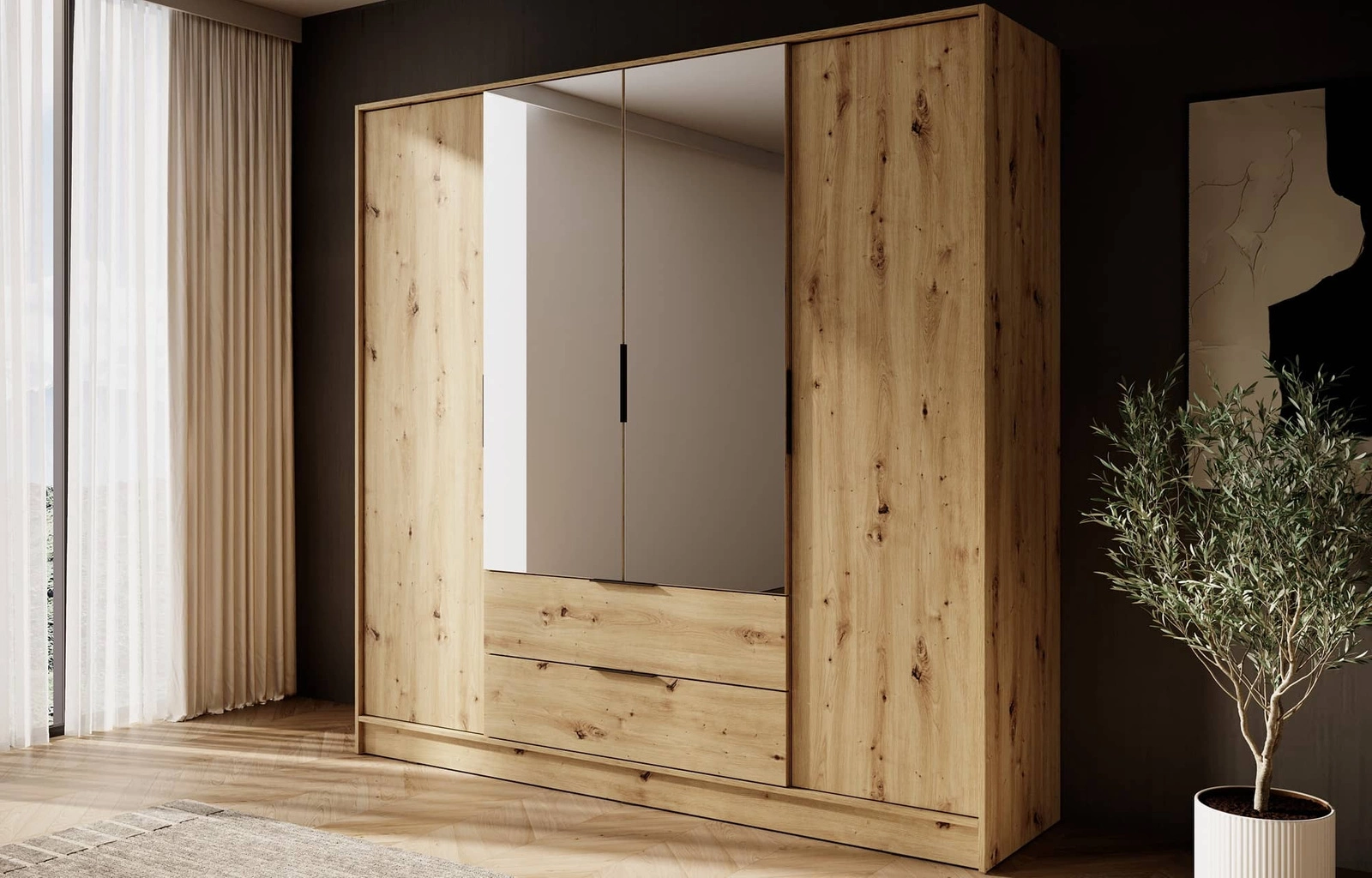 Zrcadlová šatní skříň Corse 200 cm dub artisan moderní design ideální skříň do ložnice nebo předsíně prostorné zásuvky