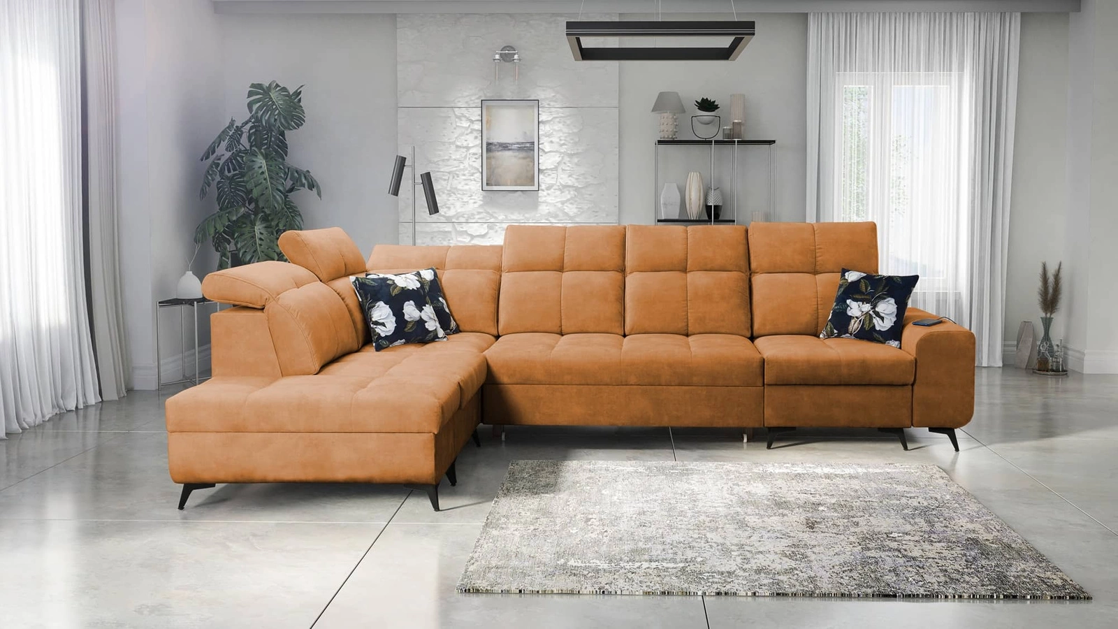 Mezi další funkce tohoto nábytku, které ocení všichni uživatelé, patří až tři nádoby na lůžkoviny, nastavitelné opěrky hlavy a nabíjecí zásuvka USB v boční části rohové skříně.