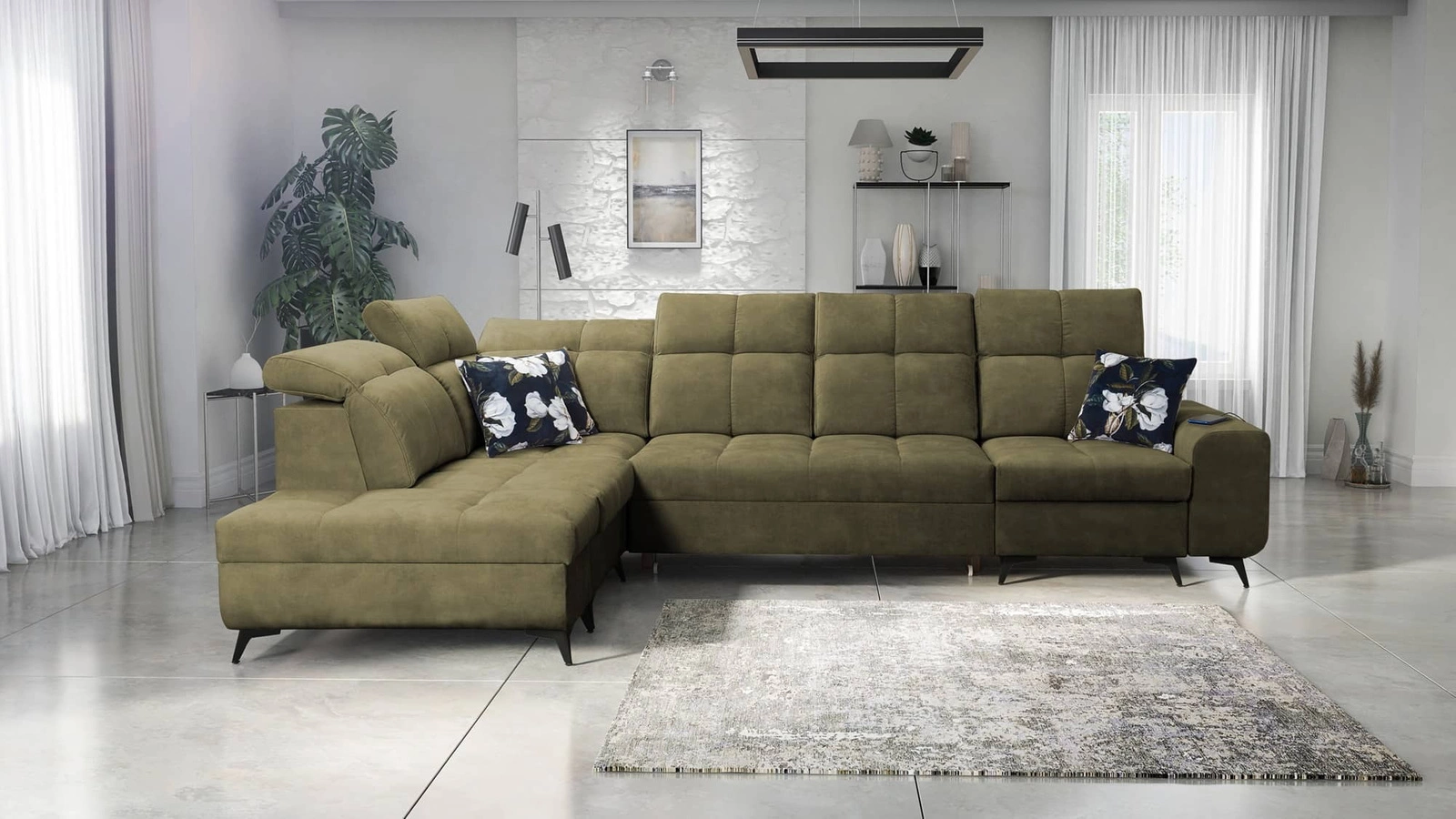 Rohová pohovka Buffalo XI v olivově zelené barvě s nastavitelnými opěrkami hlavy je zajímavě vypadajícím kusem nábytku s elegantní povrchovou úpravou.