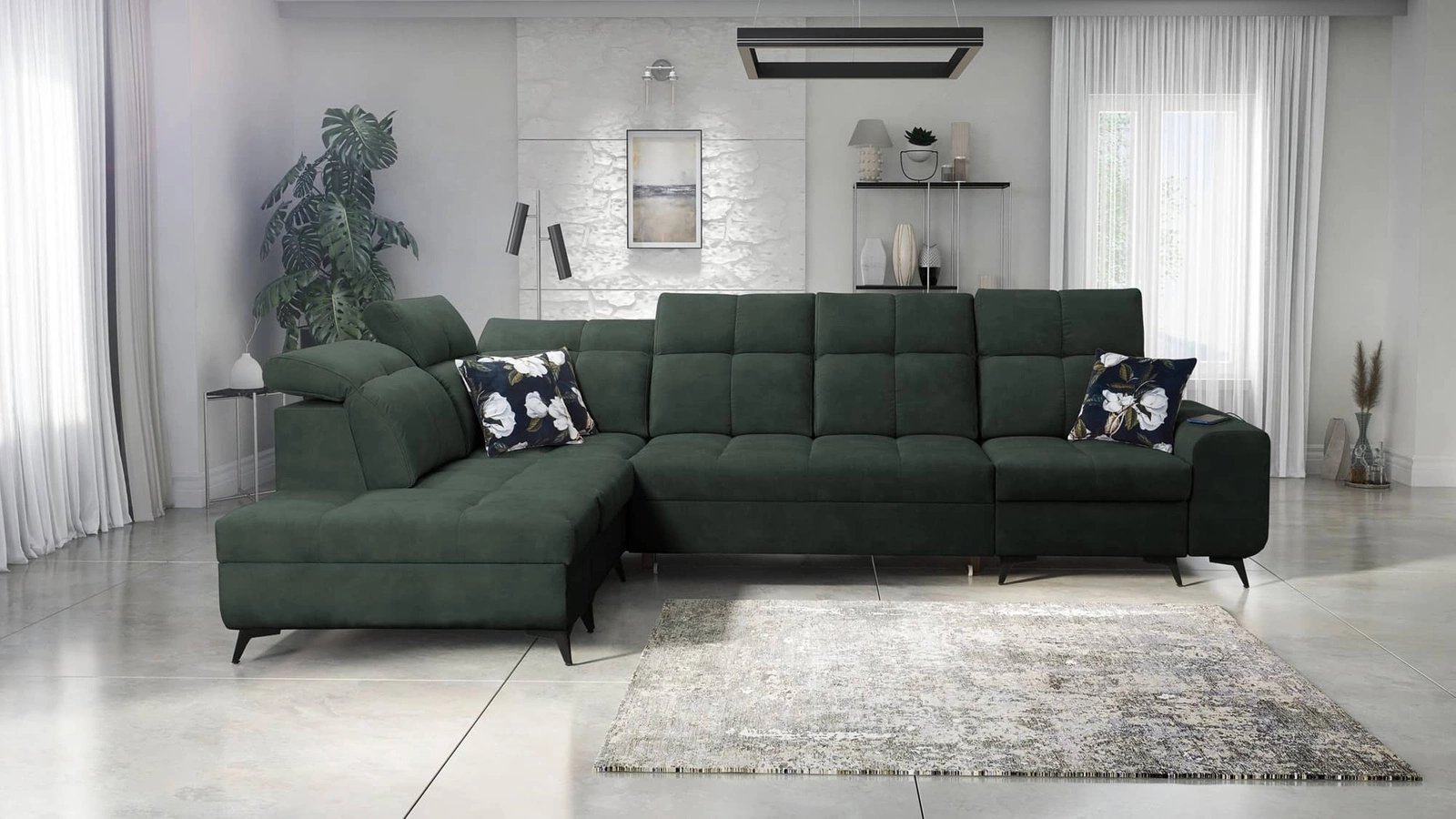 Mezi další funkce tohoto nábytku, které ocení všichni uživatelé, patří až tři nádoby na lůžkoviny, nastavitelné opěrky hlavy a nabíjecí zásuvka USB v boční části rohové skříně.