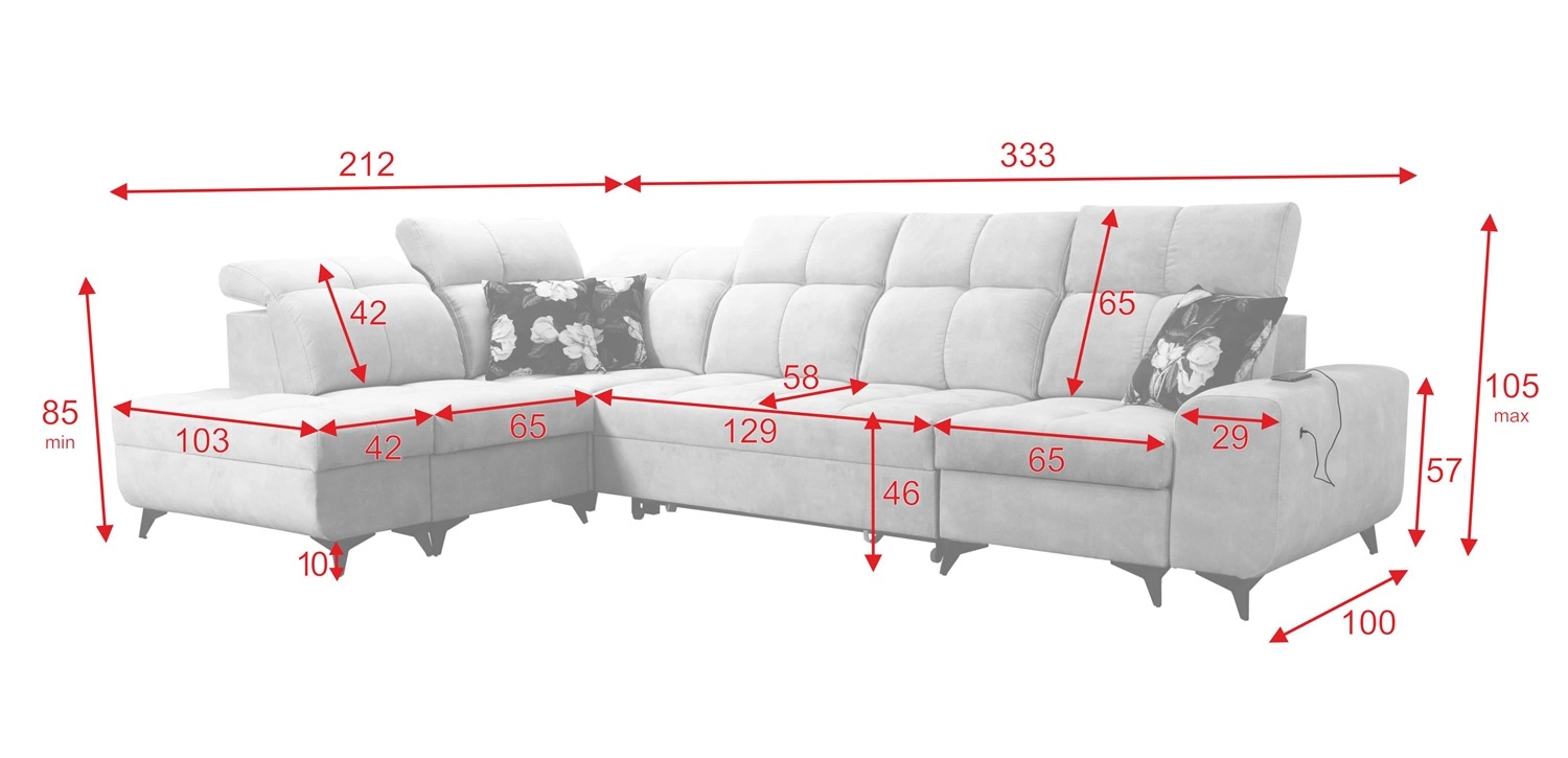 Rozměry nábytku umožňují vyplnění prostoru v prostorném obývacím pokoji nebo zasedací místnosti. Šířka rohu 333 cm, maximální výška 105 cm a hloubka 212 cm. Spací plocha rohové jednotky je 129x190 cm. Výška sedadla nábytku je 46 cm a maximální výška opěradla je 65 cm. Vlnité pružiny a polyuretanová pěna T30 je materiál, z něhož je vyrobeno sedadlo rohu. Pevné opěradlo s nastavitelnými opěrkami hlavy umožní snadné adaptace úhel opěrek hlavy podle vašich preferencí a zaručí vám pohodlný odpočinek po dlouhém dni, který oceníte vy, vaši blízcí i hosté, kteří se na tuto jedinečnou rohovou pohovku posadí.