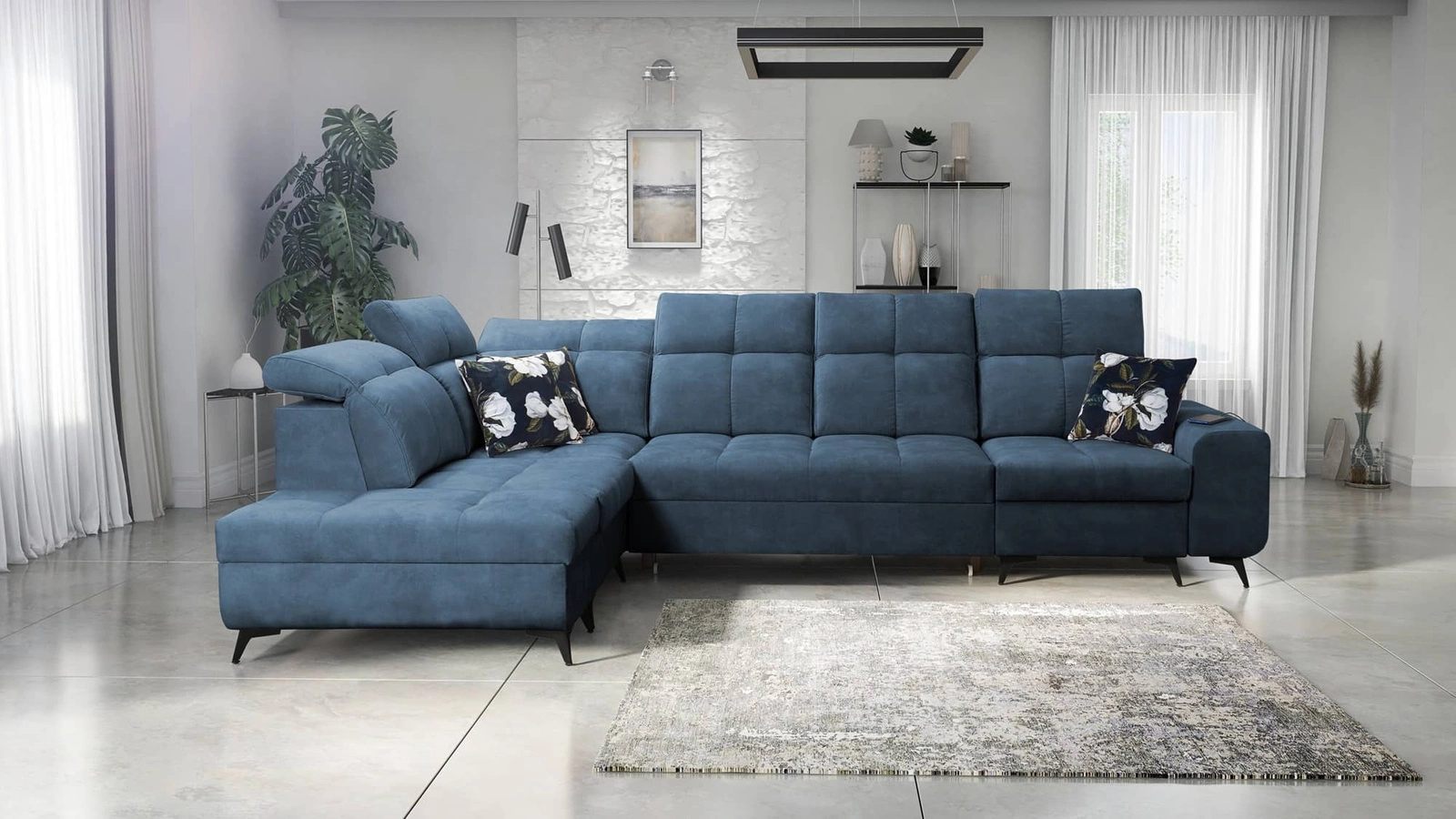 Rohová pohovka Buffalo XI v modré barvě s nastavitelnými opěrkami hlavy je zajímavě vypadající kus nábytku s elegantním povrchem.