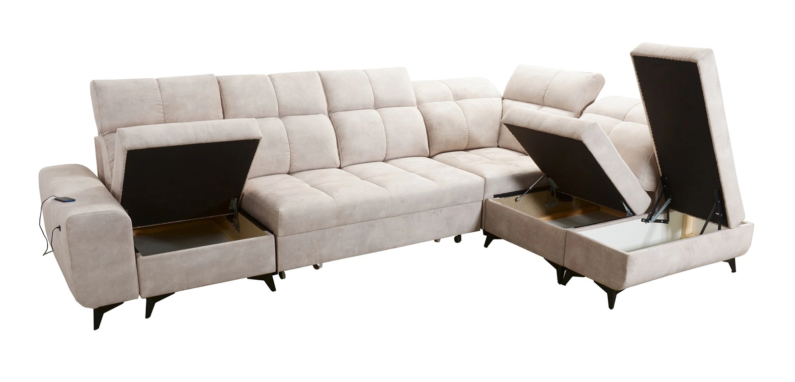 Mezi další funkce tohoto nábytku, které ocení všichni uživatelé, patří až tři nádoby na lůžkoviny, nastavitelné opěrky hlavy a nabíjecí zásuvka USB v boční části rohové skříně.