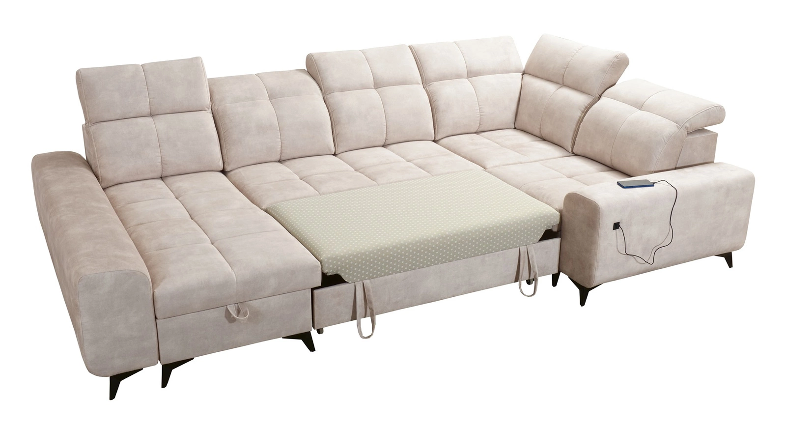 Mezi další funkce tohoto nábytku, které ocení všichni uživatelé, patří až dva kontejnery na lůžkoviny, nastavitelné opěrky hlavy a nabíjecí zásuvka USB v boční části rohové skříně.