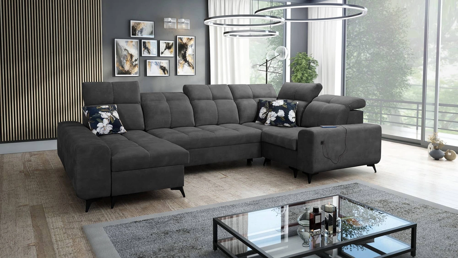Mezi další funkce tohoto nábytku, které ocení všichni uživatelé, patří až dva kontejnery na lůžkoviny, nastavitelné opěrky hlavy a nabíjecí zásuvka USB v boční části rohové skříně.