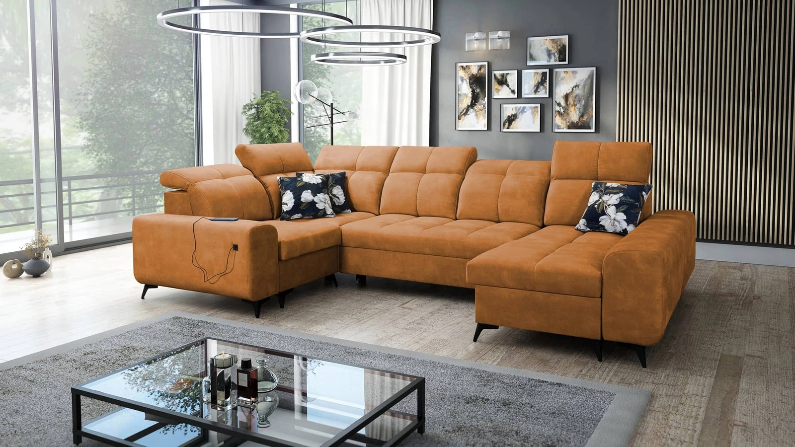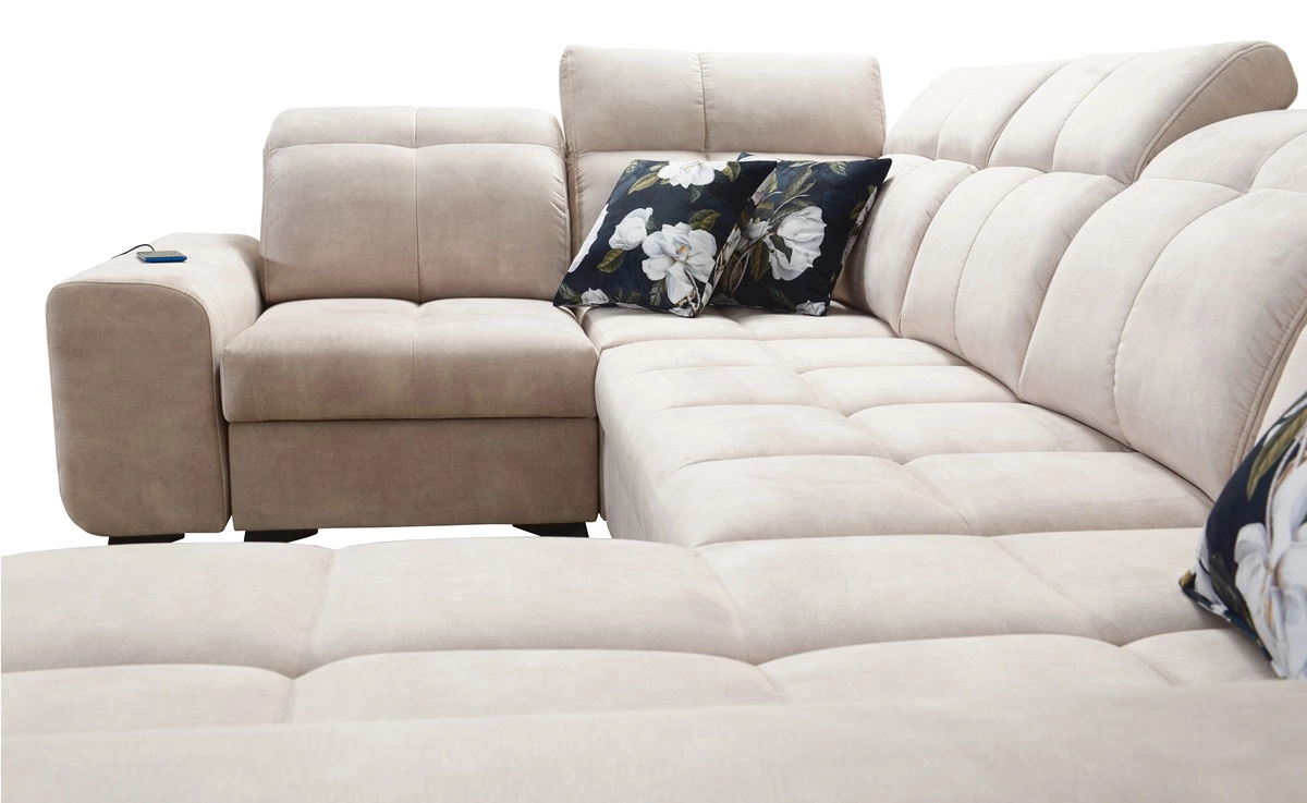 Mezi další funkce tohoto nábytku, které ocení všichni uživatelé, patří až dva kontejnery na lůžkoviny, nastavitelné opěrky hlavy a nabíjecí zásuvka USB v boční části rohové skříně.