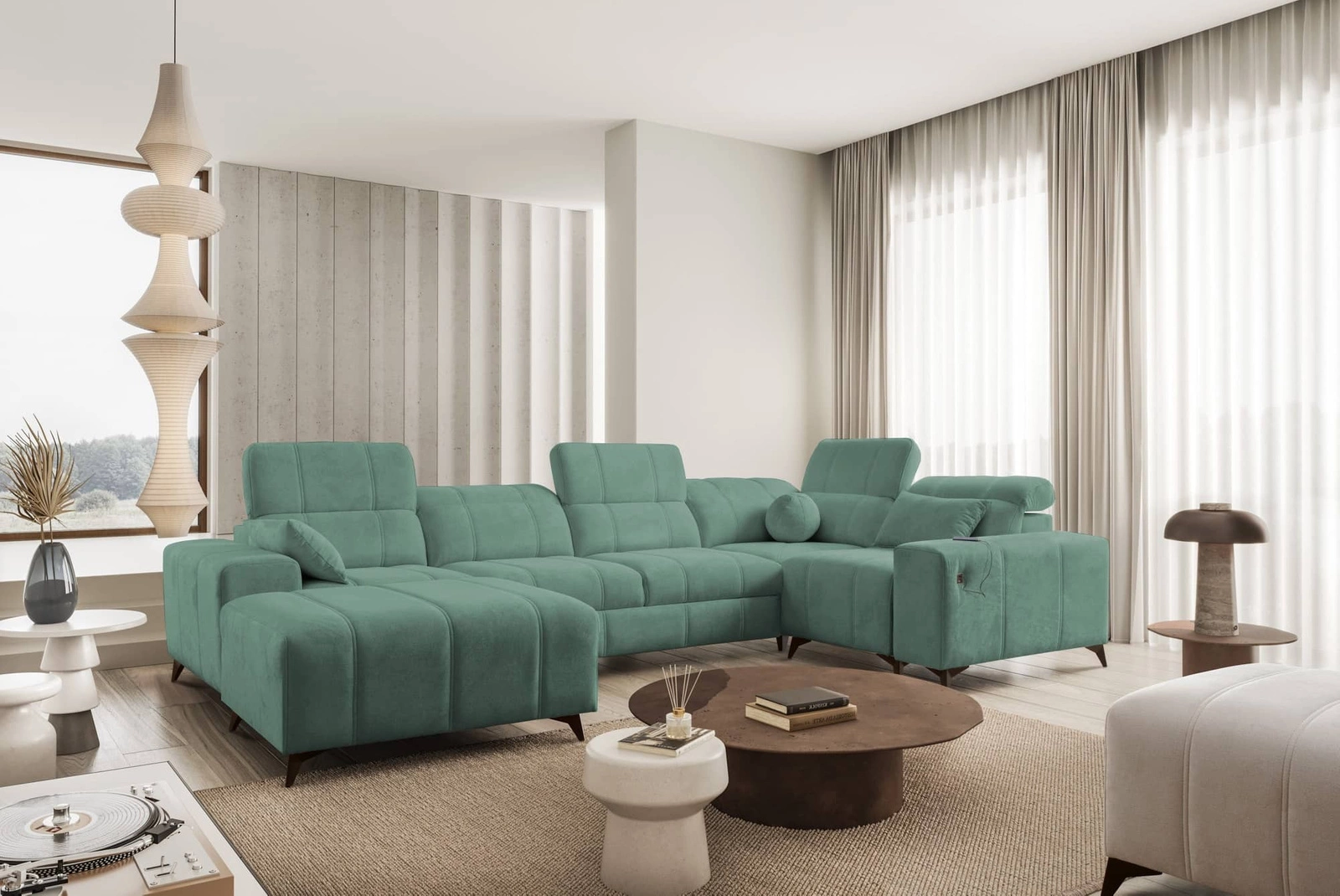 Rohová pohovka Penejos IV v zelené barvě s nastavitelnými opěrkami hlavy je nádherný kus nábytku se zárukou nejvyššího pohodlí a funkčnosti.
