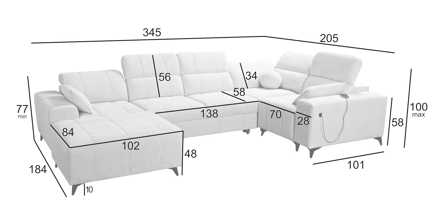 Rozměry nábytku umožní vyplnění prostoru v prostorném obývacím pokoji nebo zasedací místnosti. Šířka rohu 345 cm, maximální výška 100 cm a hloubka 205 cm. Spací plocha rohové jednotky je 127x268 cm. Výška sedadla nábytku je 48 cm a maximální výška opěradla je 56 cm. Vlnité pružiny a polyuretanová pěna T30 je materiál, z něhož je vyrobeno sedadlo rohu. Pevné opěradlo s nastavitelnými opěrkami hlavy umožní snadné adaptace úhel opěrek hlavy podle vašich preferencí a zaručí vám pohodlný odpočinek po dlouhém dni, který oceníte vy, vaši blízcí i hosté, kteří se na tuto jedinečnou rohovou pohovku posadí.