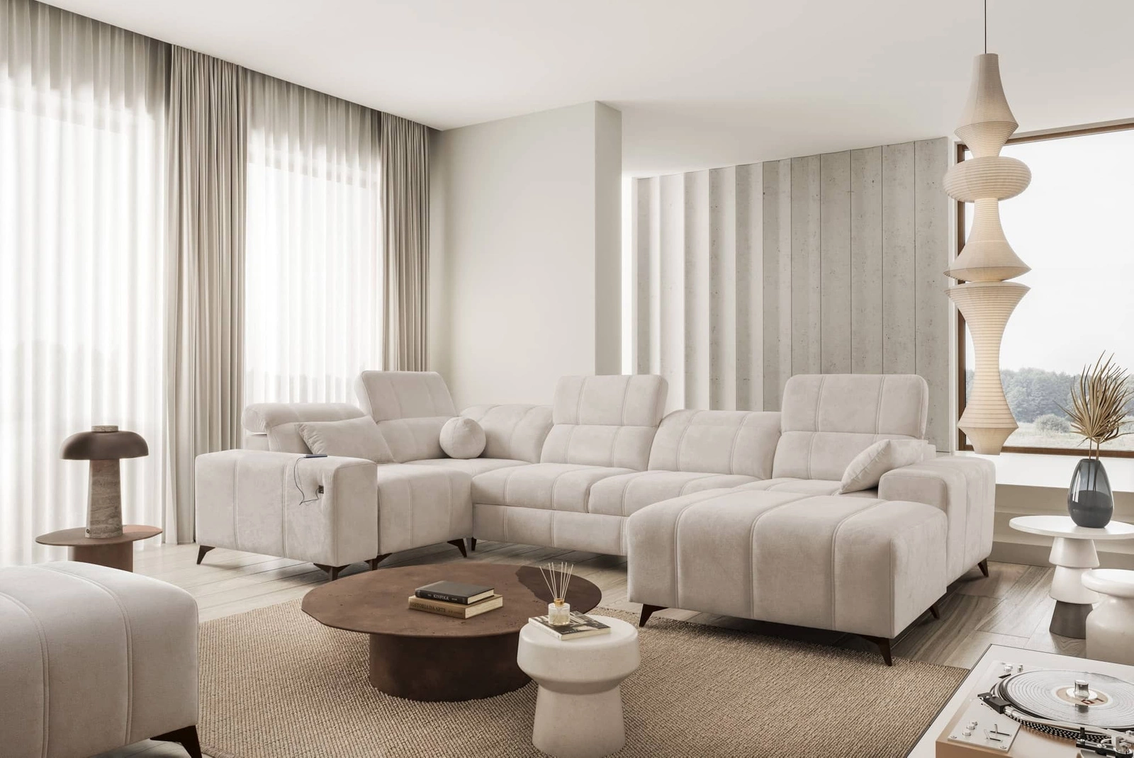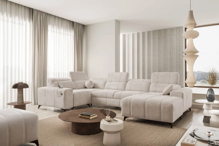 Rohová pohovka Penejos IV v béžové barvě s nastavitelnými opěrkami hlavy je nádherný kus nábytku se zárukou nejvyššího pohodlí a funkčnosti.