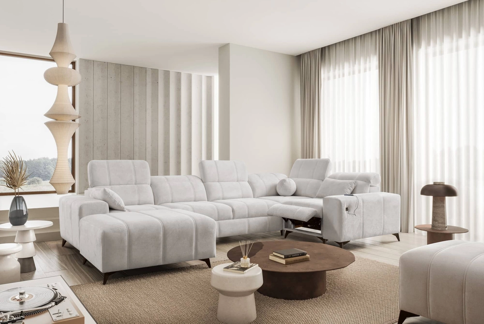 Mezi doplňky tohoto nábytku, které ocení všichni uživatelé, patří výsuvná podnožka, nádoba na lůžkoviny, funkce spaní a nabíjecí zásuvka USB na boku rohové skříně.