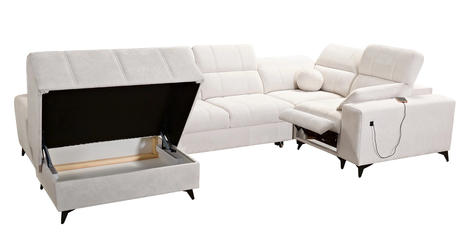Mezi doplňky tohoto nábytku, které ocení všichni uživatelé, patří výsuvná podnožka, nádoba na lůžkoviny, funkce spaní a nabíjecí zásuvka USB na boku rohové skříně.