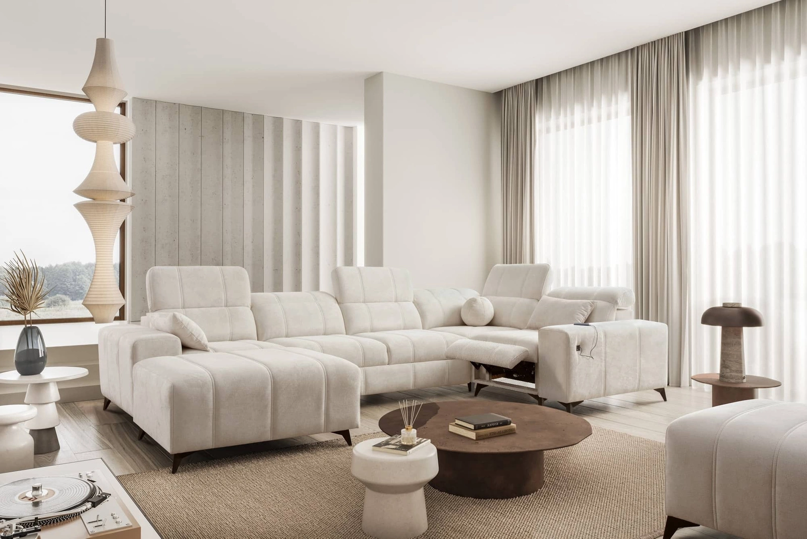 Rohová pohovka Penejos IV Lux v krémové barvě s výsuvnou podnožkou je mimořádně pohodlný kus nábytku se zajímavou povrchovou úpravou.