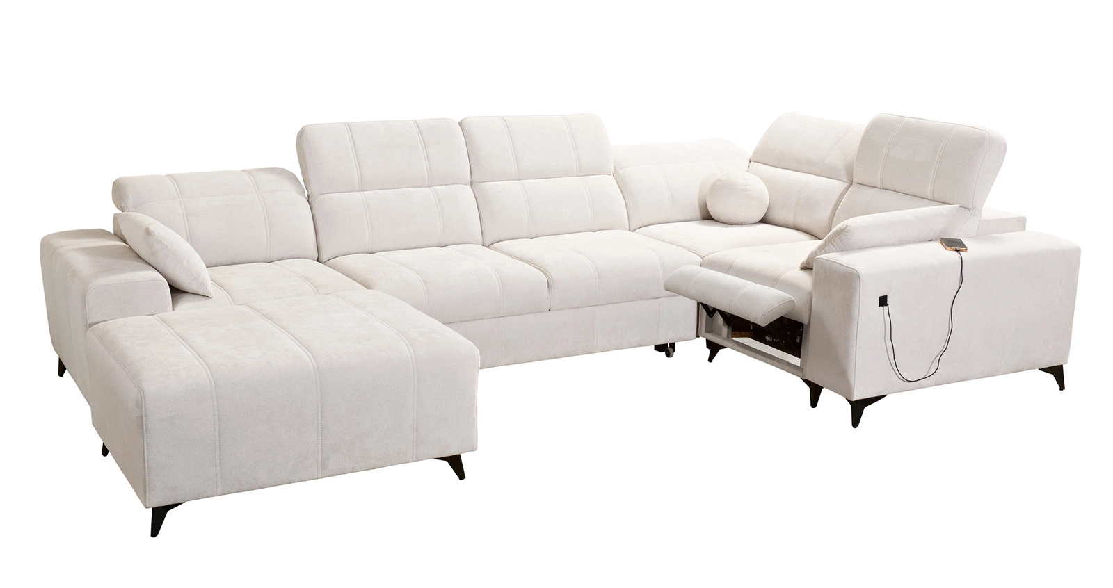 Mezi doplňky tohoto nábytku, které ocení všichni uživatelé, patří výsuvná podnožka, nádoba na lůžkoviny, funkce spaní a nabíjecí zásuvka USB na boku rohové skříně.
