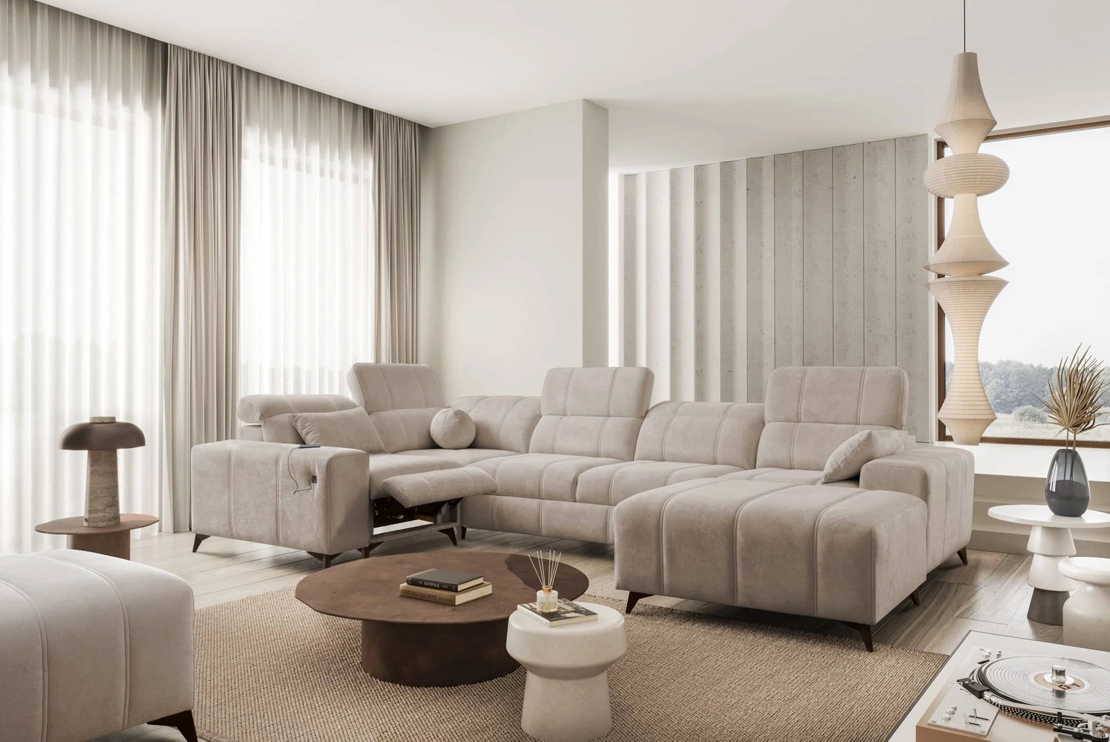 Rohová pohovka Penejos IV Lux v tmavě béžové barvě s výsuvnou podnožkou je mimořádně pohodlný kus nábytku se zajímavou povrchovou úpravou.