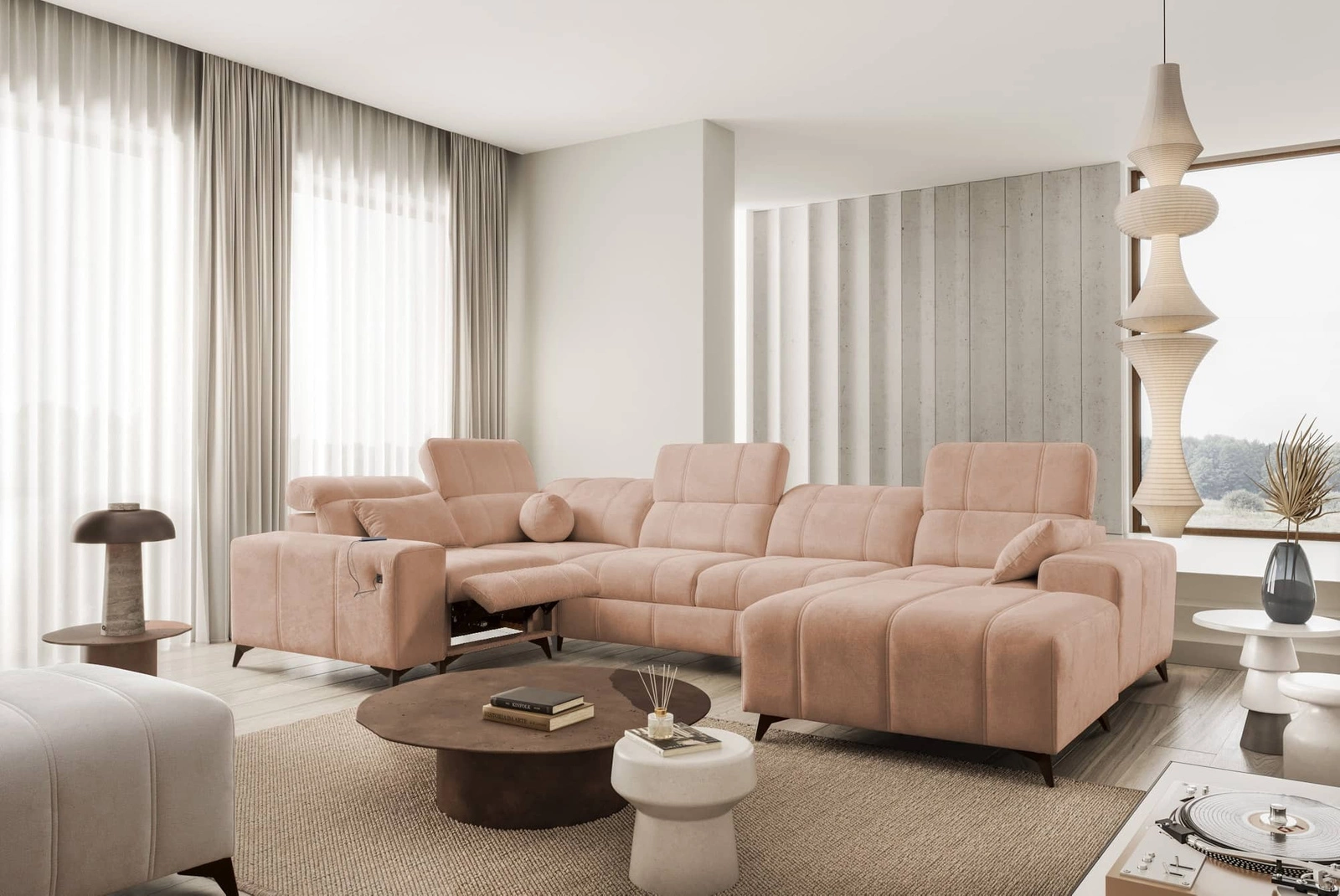Rohová pohovka Penejos IV Lux v lososové barvě s výsuvnou opěrkou nohou je mimořádně pohodlný kus nábytku se zajímavou povrchovou úpravou.
