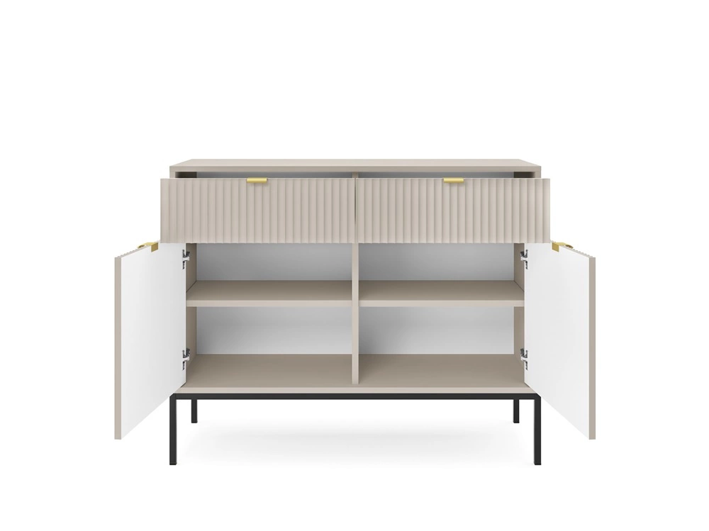 Rýhované fronda z MDF tloušťka 18 mm přidat zvláštní kouzlo. Stylovou povrchovou úpravou čel komody jsou následující prvky rukojeti se zlatým okrajem. Struktura nábytku je různorodá černé kovové nohy o výšky 20 cm.