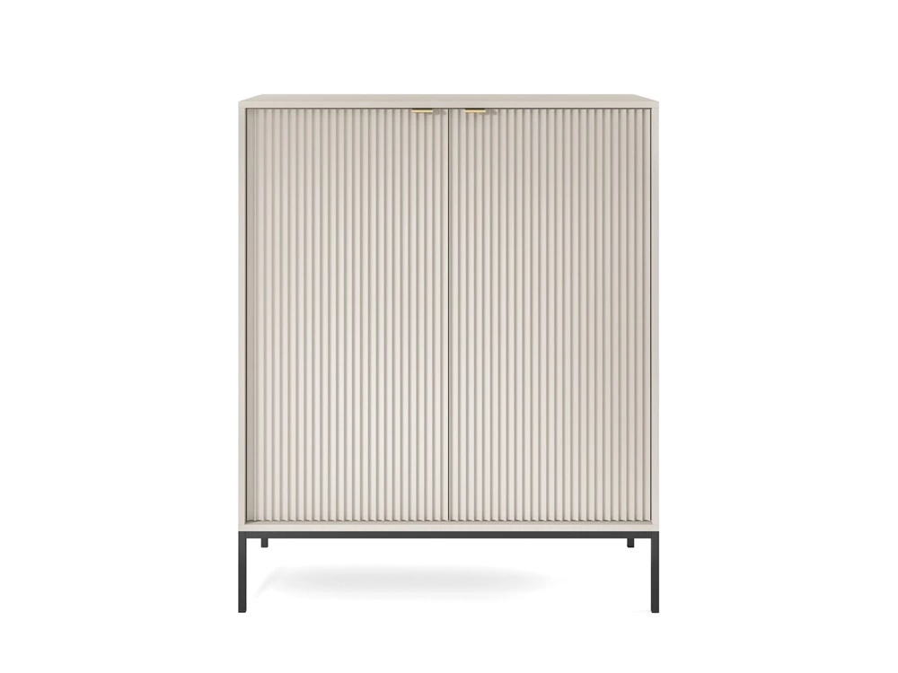 Rýhované fronda z MDF tloušťka 18 mm přidat zvláštní kouzlo. Stylovou povrchovou úpravou čel komody jsou následující prvky rukojeti se zlatým okrajem. Struktura nábytku je různorodá černé kovové nohy o výšky 20 cm.