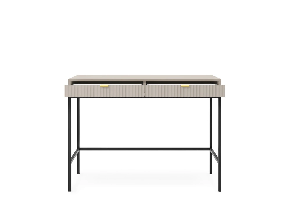 Rýhované fronda z MDF tloušťka 18 mm přidat zvláštní kouzlo. Stylovou povrchovou úpravou čel zásuvek jsou rukojeti se zlatým okrajem. Struktura nábytku je různorodá černé kovové nohy o matný povrch.