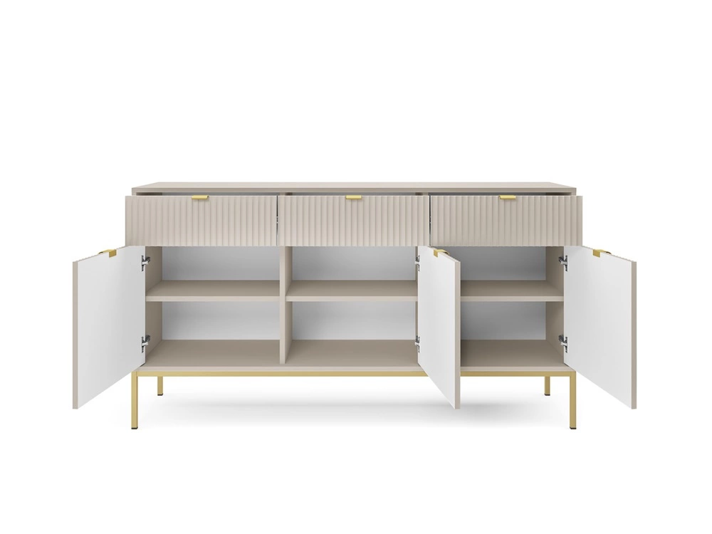 Komoda Lovro 154 cm v béžové barvě je stylový kus nábytku, který se skvěle hodí do každého obývacího pokoje nebo jídelny.