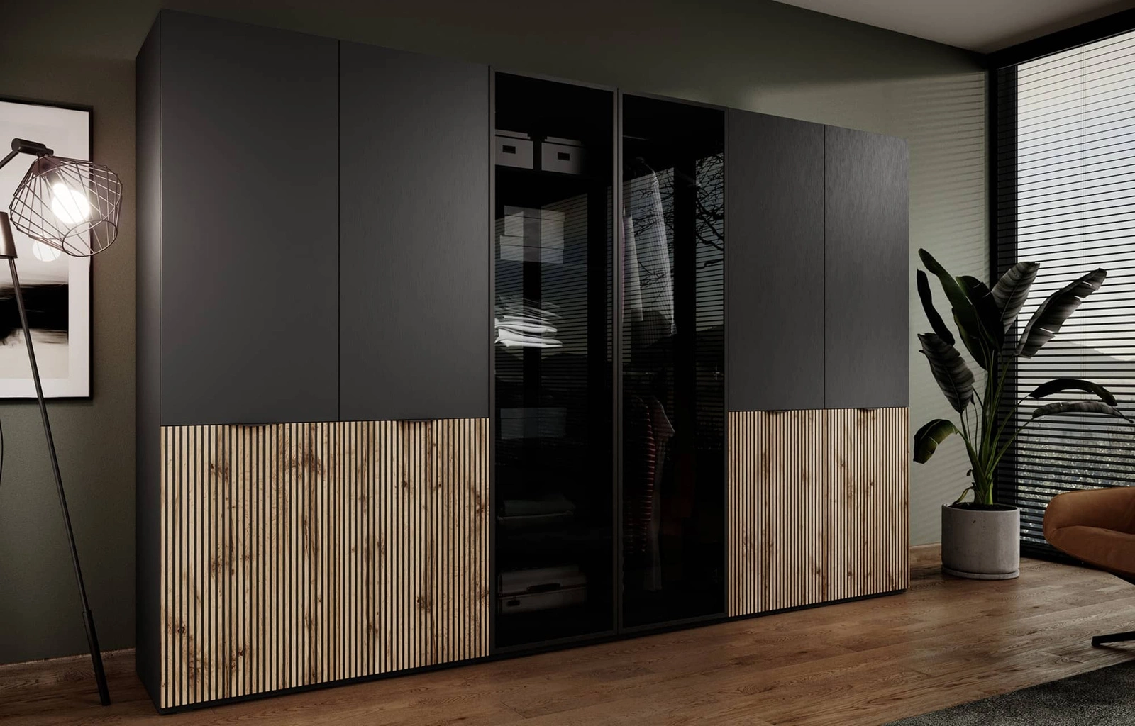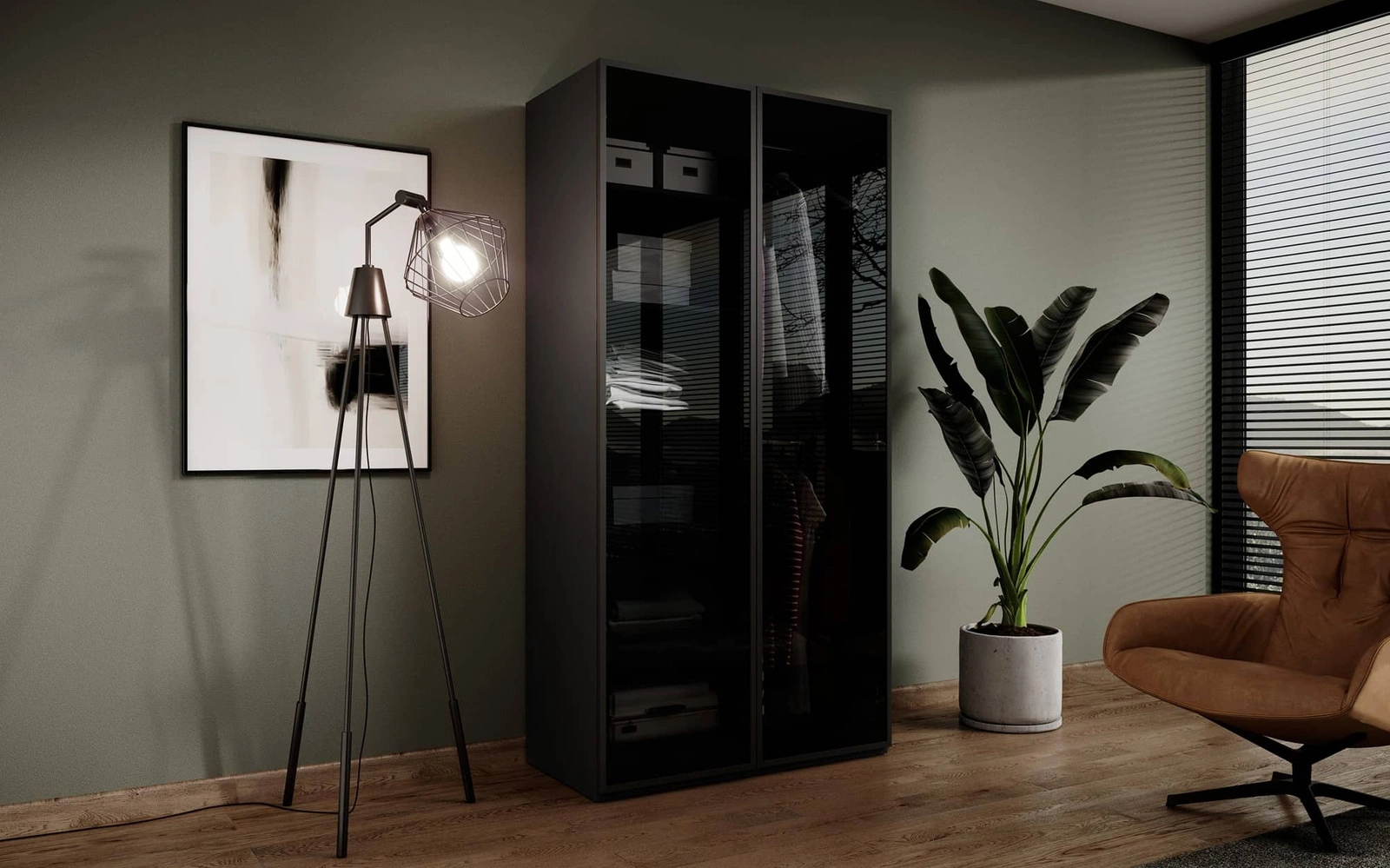 Šatní skříň Sandbox 101 cm černá elegantní a funkční šatní skříň se skleněnými předěly kus nábytku z modulární kolekce šatních skříní antisol glass
