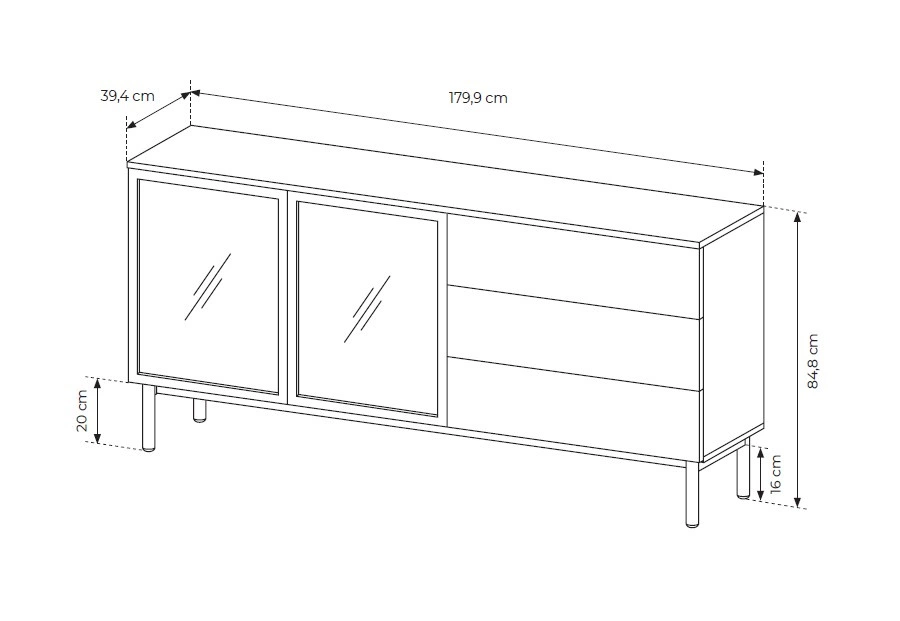Komoda byla vyrobena z vysoce kvalitní laminovaná deska tloušťka 16 mm, která je odolná vůči vnějším vlivům, jako jsou otlaky, nárazy a nešťastné škrábance. Černý rám z MDF o tloušťce 18 mm jasně vymezuje prosklenou část komody. Prosklená čela jsou vyrobena z tvrzené bezpečnostní sklo. Komoda je vybavena diskrétní zásuvkou osvětlení LED, dodává designu vizuální lehkost a funkčnost. Struktura nábytku byla vyztužena vkusnými prvky dřevěnými nohami v černé barvě.