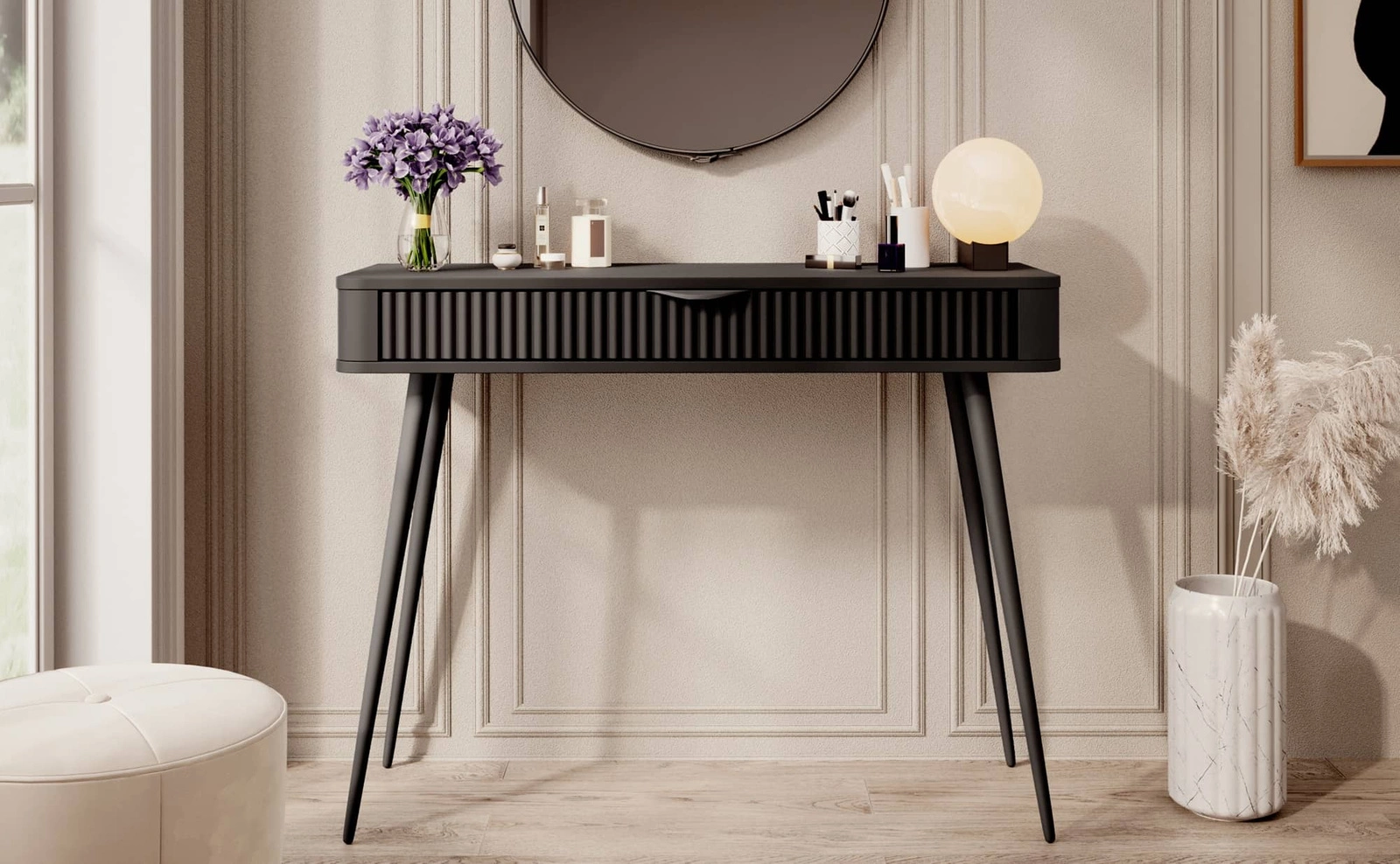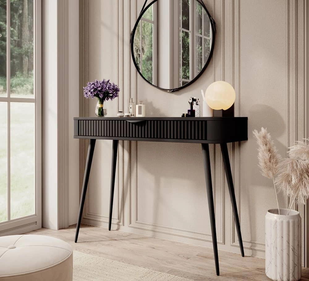 Lante černá konzola se zásuvkou stylový a funkční toaletní stolek zakřivený masivní tvar rýhované přední hrany rukojeti