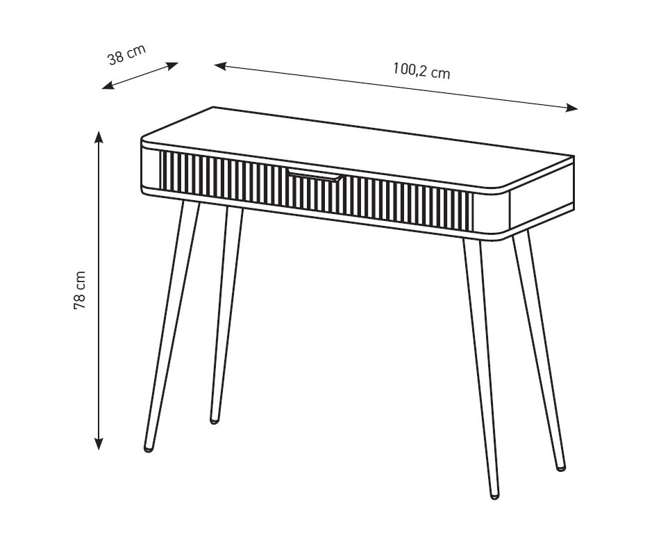 Nábytek je vyroben z 1 zásuvka. Toaleta se zárukami zásuvky pohodlné a bezproblémové používání a trvanlivost celého nábytku po mnoho let používání. Díky svému tvaru a všestrannosti se konzola skvěle hodí pro použití v domácnosti jako toaletní stolek, který usnadní organizaci dámské kosmetiky a drobností, i jako stůl pro domácí kancelář.
