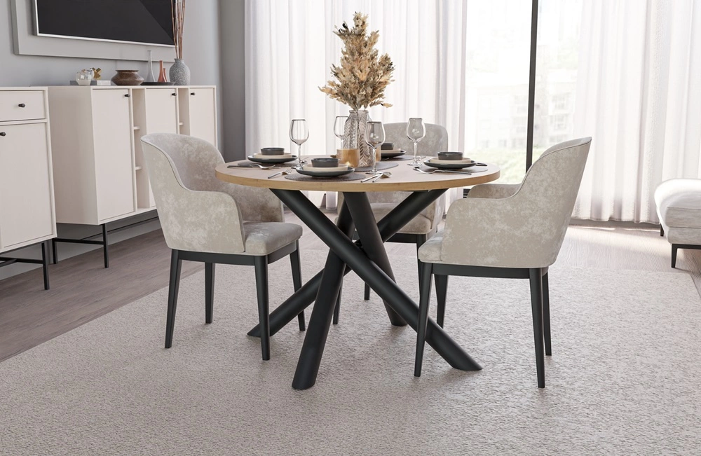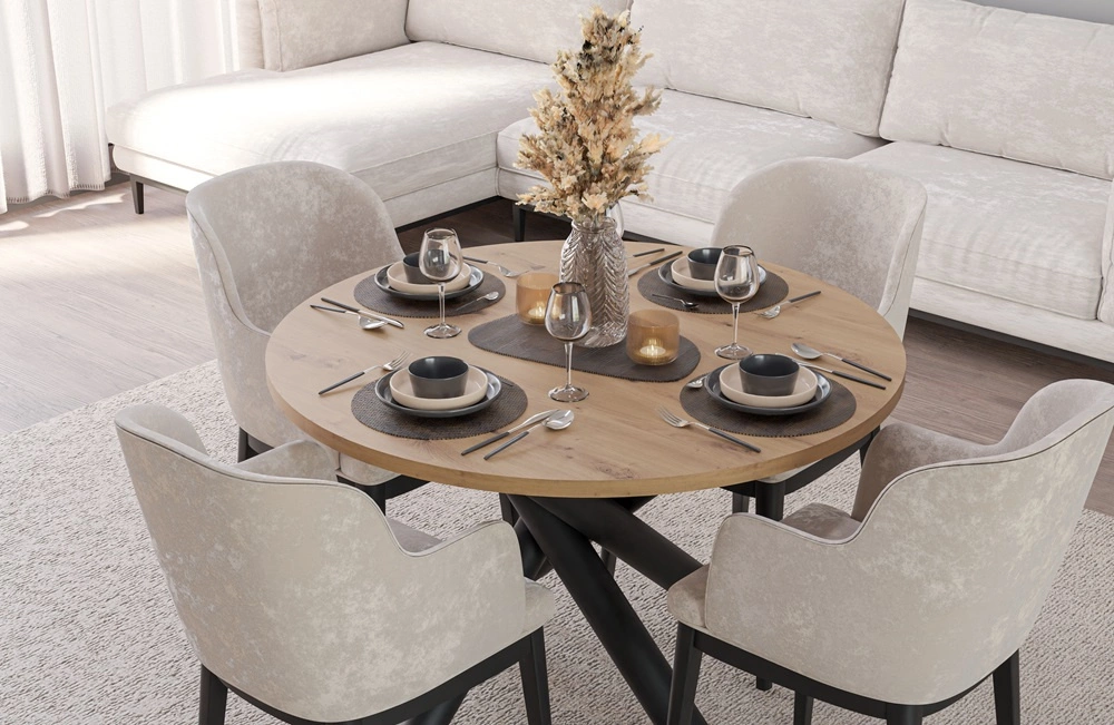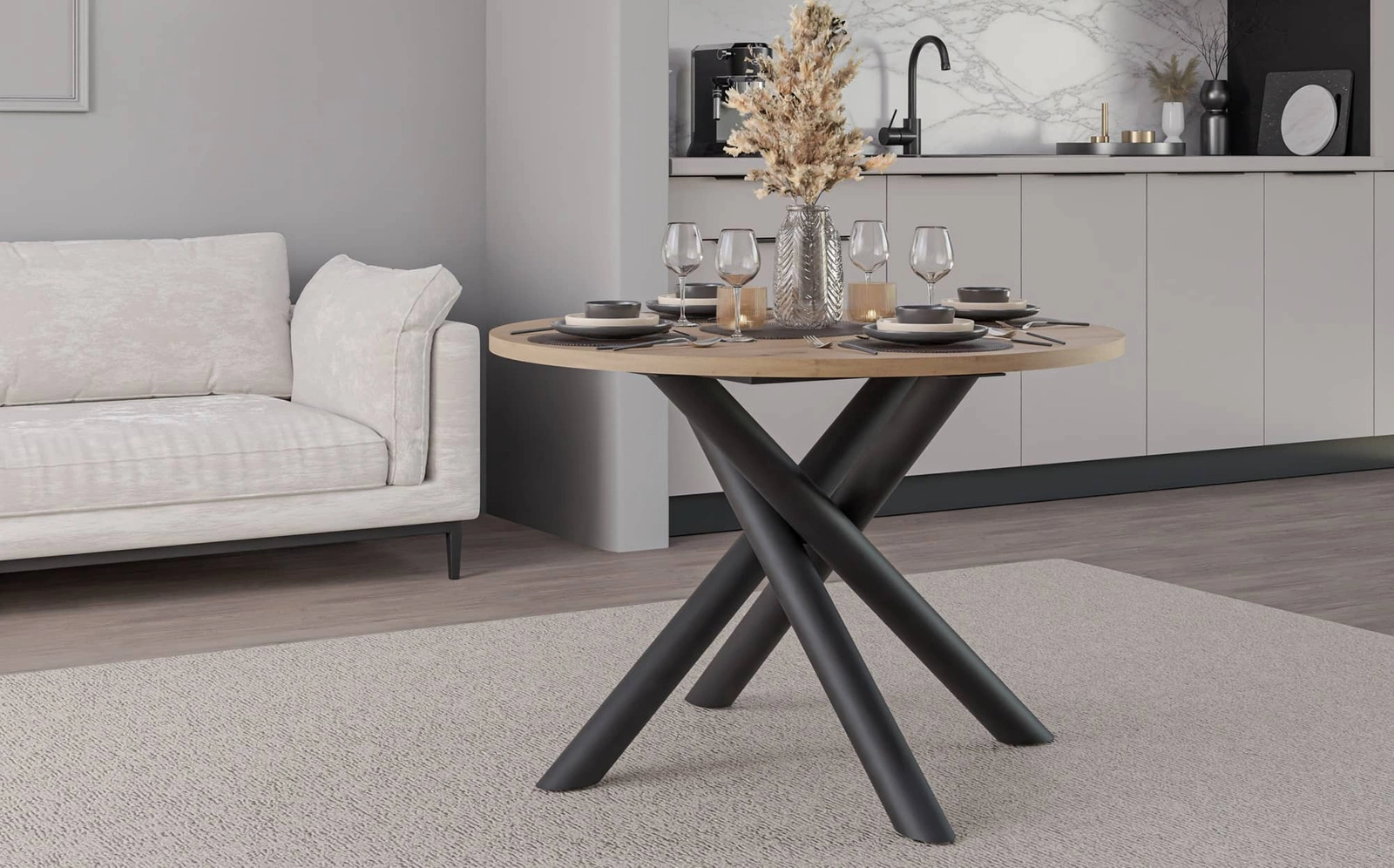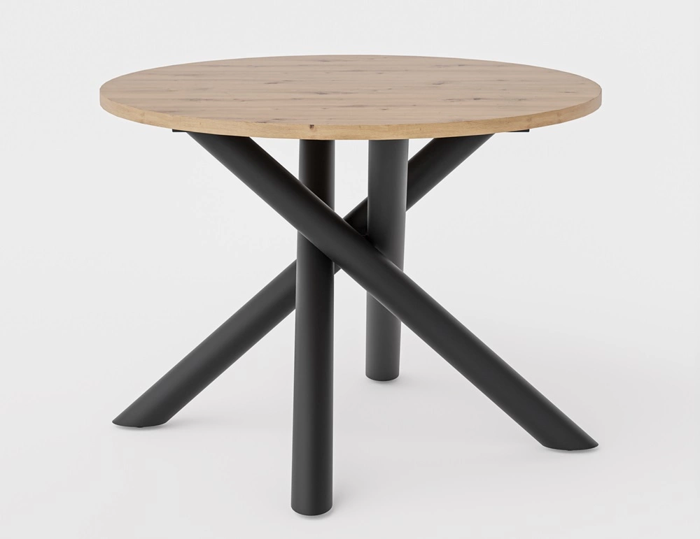 Kulatý stůl Lyon 110 cm v barvě dub artisan / černá je stylový kus nábytku, který dokonale zapadne do každé moderní jídelny.